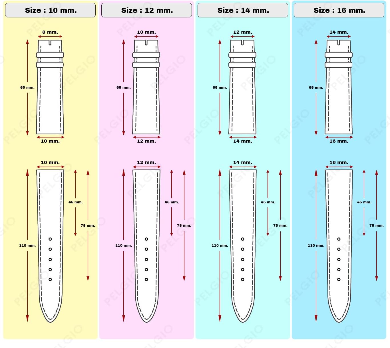 Buckle : Stainless Steel Thickness : 3-5 mm. Length : Buckle Side 75 mm. / Holes Side 120 mm. Width : Lug Wide 18 mm. / Buckle Wide 16 mm. Width : Lug Wide 20 mm. / Buckle Wide 18 mm. Width : Lug Wide 22 mm. / Buckle Wide 20 mm. Width : Lug Wide 22 mm. / Buckle Wide 20 mm. Width : Lug Wide 24 mm. / Buckle Wide 22 mm. Width : Lug Wide 26 mm. / Buckle Wide 24 mm.