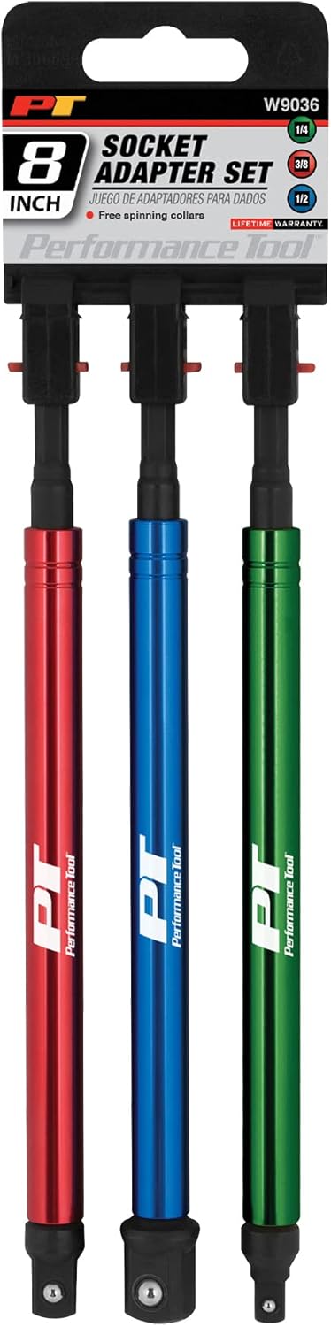 Transforms your power drill into a power nut/socket driver. Free spinning collar allows you to maintain a positive grip while fastening. Durable Cr-V construction with black phosphate finish. Ball bearing ensures sockets are securely seated. Color coded 1/4, 3/8 and 1/2 inch drive sizes. 8 inch total length (200mm).