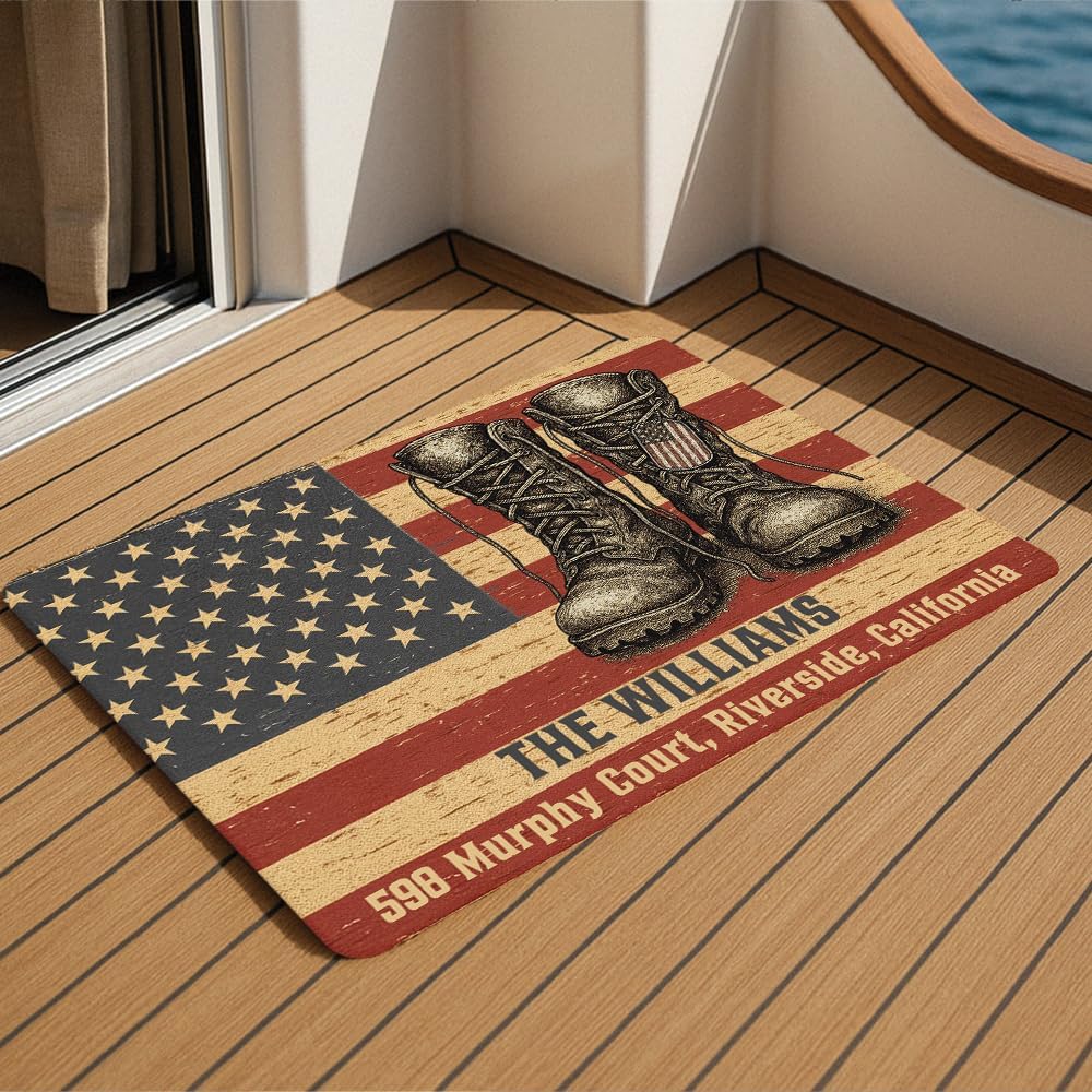 Show your pride and respect at the very first step with this personalized patriotic doormat designed for military families and veterans. Featuring a vintage American flag background, combat boots, and a dog tag, this mat symbolizes honor, sacrifice, and national pride.Customize it with your family name and full address (e.g., “THE WILLIAMS – 598 Murphy Court, Riverside, California”) for a personal and meaningful welcome. It’s perfect for front porches, garage entries, or military-style homes that value both aesthetics and symbolism.The mat is crafted from high-quality polyester that resists fading even with outdoor use. The underside features a non-slip rubber backing that holds firmly on tile, wood, or concrete—keeping it steady and secure in high-traffic areas.Each detail is thoughtfully designed: the rustic stars and stripes evoke strength and unity, while the weathered boots and dog tag reflect honor and service. The overall tone blends perfectly with Americana, military, or rustic décor themes.Care is simple: shake it out, use a handheld vacuum, or wipe down with a damp cloth as needed. Avoid soaking or prolonged direct sunlight to preserve its vintage colors.This mat also makes an excellent gift for veterans, active-duty service members, or patriotic families. Whether celebrating Veterans Day, Memorial Day, the 4th of July, or a military homecoming, it’s a meaningful and practical piece they’ll use daily.Add purpose and pride to your home’s entrance—every guest will see what you stand for.