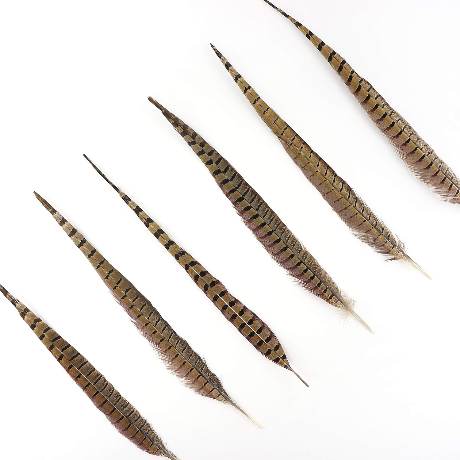 Assorted Natural Ringneck and Golden Pheasant Tail Feathers will range approximately 14-18 inches long and come in a 10 piece package. These pheasant tail feathers are stiff and natural colored. The Golden Pheasant feathers have a main color of lighter brown with a thin, dark brown with a zebra-like stripes throughout the feather. The Ringneck Pheasant has a main color of medium brown with a dark brown stripe going across the body of the feather. There will be a variety of both ringneck and golden pheasant styles and sizes in this 10 piece package.This product is part of our Packaged Feathers - Pheasant category. SUGGESTED USES: Packaged Feathers can be used in many Arts and Crafts projects, School and DIY Projects (Scrapbooking, Card Making, Gift Wrapping, Stickers), Feather Mask Making, Feather Fashion Accessories for Headbands, Hair, Hat, Millinery, Shoe Clips, Purse Embellishments, Bracelett, Earrings, Necklaces, Floral Arrangements, Feather Bouquets, Boutonnieres, and more. Packaged Feathers are also perfect for Fly Fishing, and Fly Tying. Longer feathers that are packaged are great for making Feather Headdresses for Carnival, Mardi Gras, Festivals, Native American or Aztec Cultural Dance, along with Feather Home and Holiday Decor. SIZE: 14-18" (10 piece pkg)