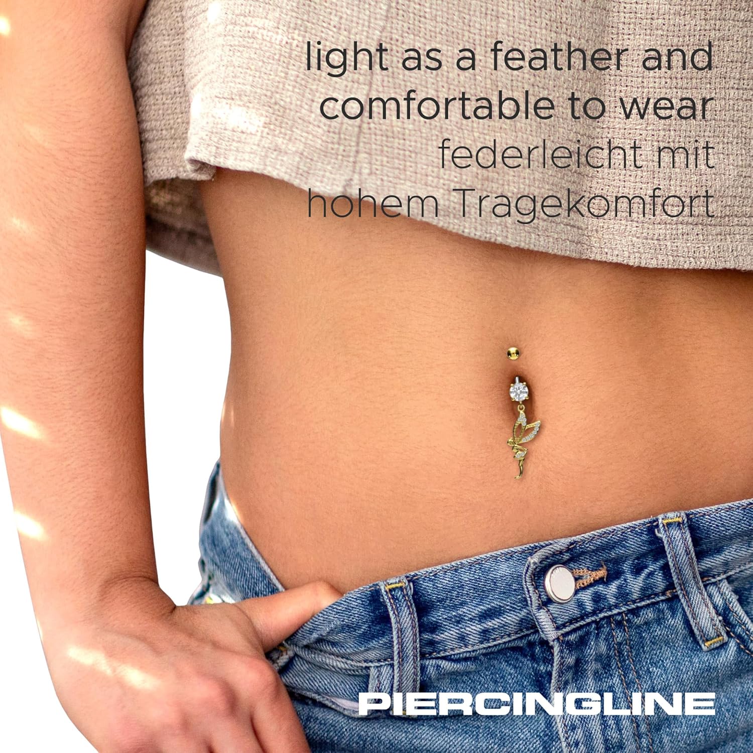 Titanium - Bellybutton Piercing with 925 Silver Design Fairy This bananabell is mainly made of high quality titanium and therefore features useful properties such as high durability and particularly good skin compatibility. Only the fairy set with crystals was fabricated from 925 silver. If desired, a scratch-resistant PVD coating provides a vibrant color of choice. The thickness of the bar is 1.6 mm, allowing numerous combinations with other products from our versatile range. The bar length, on the other hand, is always 10 mm. Material: 925 silver / titanium Surface: highly polished / PVD coating Material color: gold-colored / rosegold-colored / silver-colored Crystal color: crystal clear Bar thickness: 1.6 mm Bar length: 10 mm Ball size: 5 mm Design size (fairy): 14 x 29 mm