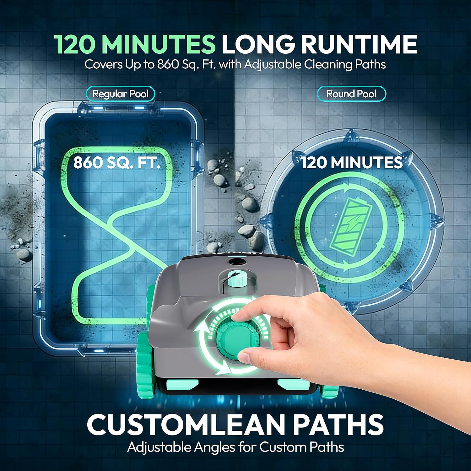 | Key Product Features | ✅ 【Dual-Layer Filtration for Leaves & Fine Debris】– 180μm + 50μm dual filters efficiently capture large debris like leaves, as well as fine dust & dirt, pollen, bugs and other fine debris. Designed for consistent cleaning performance, the robot pool cleaner helps improve water clarity with less manual effort., ✅ 【Enhanced Edge & Corner Cleaning for Full Pool Coverage】 – Auto back-away and re-approach movement improves cleaning along pool edges and corners. Tackles algae buildup in corner and edge areas and helps reduce missed spots for better overall pool coverage., ✅ 【Long Runtime & Ultra Easy Maintenance】 – Enjoy up to 120 minutes of runtime, cleaning pools up to 860 sq ft per cycle—helping save time and reduce your regular cleaning workload. Removable filters are easy to empty and rinse, and the included hook makes retrieval quick and hassle-free—no more manual vacuuming., ✅ 【Smart Auto-Parking & Safe Fast Charging】 – Automatically parks at the pool edge when battery is low for easy retrieval. Fast full charge in about 3.5 hours with built-in multi-layer protection, providing worry-free charging every time., ✅ 【Strong Obstacle Crossing & Smooth Navigation】 – Large wheels enable superior obstacle-crossing performance and smooth movement. Easily navigates flat or ≤10° sloped above-ground pools without getting stuck, keeping the robot cleaner running reliably. |