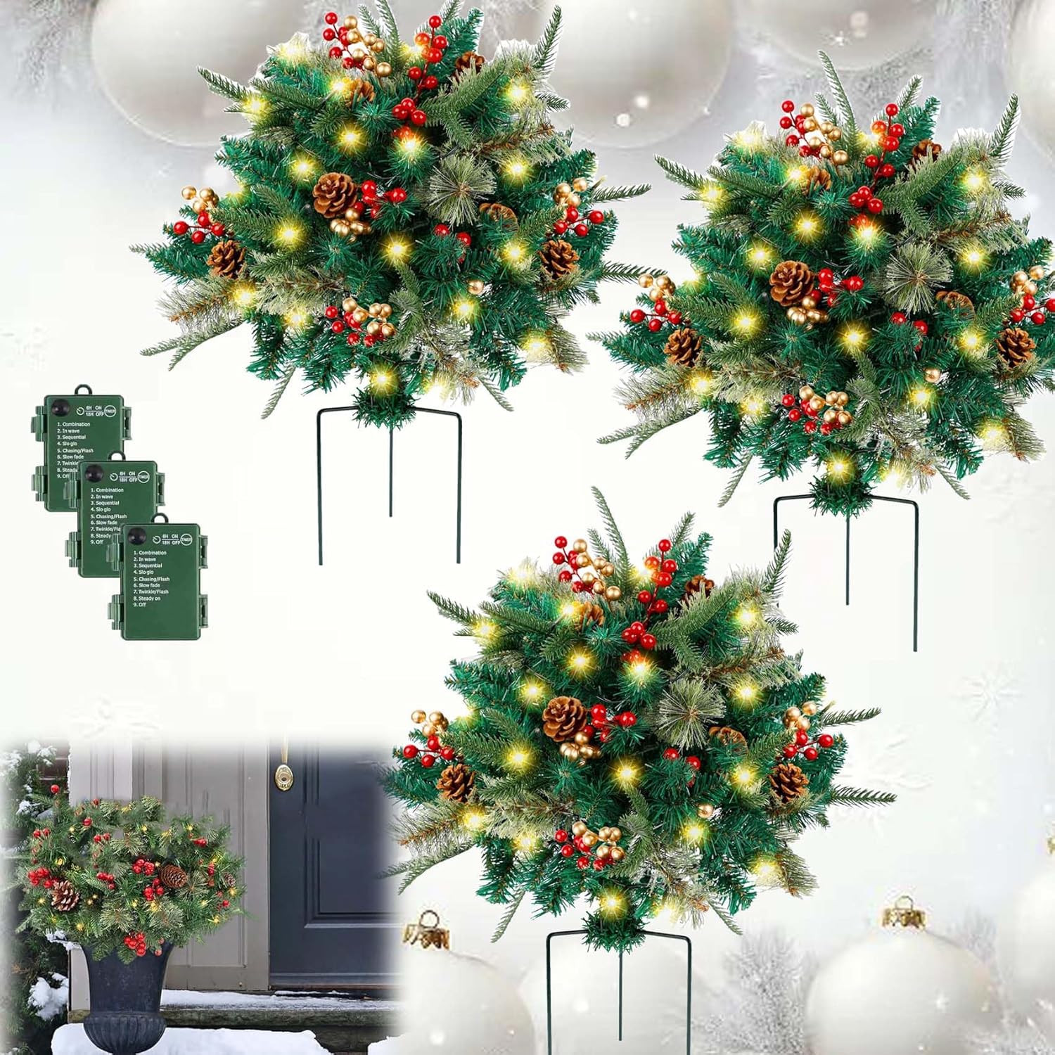 Topsworth Prelit Planter Bushes Christmas,Outdoor Christmas Planter Arrangement,Faux Holiday Planters With Lights,Christmas Outdoor Planter Decorations Lighted Christmas Urn Filler Specification: Product Name: Holiday Planter Color: Green Size: 41cm/16in Material: PVC Power Supply: Battery Operated Built-in lights: Yes Base type: Stand Package Includes: 1/2/3Pcs * Holiday Planters Note: 1.Please allow slight measurement deviations due to manual measurement.2.Due to the different monitor and light effect, the actual color of the item might be slightly different from the color showed in the pictures.