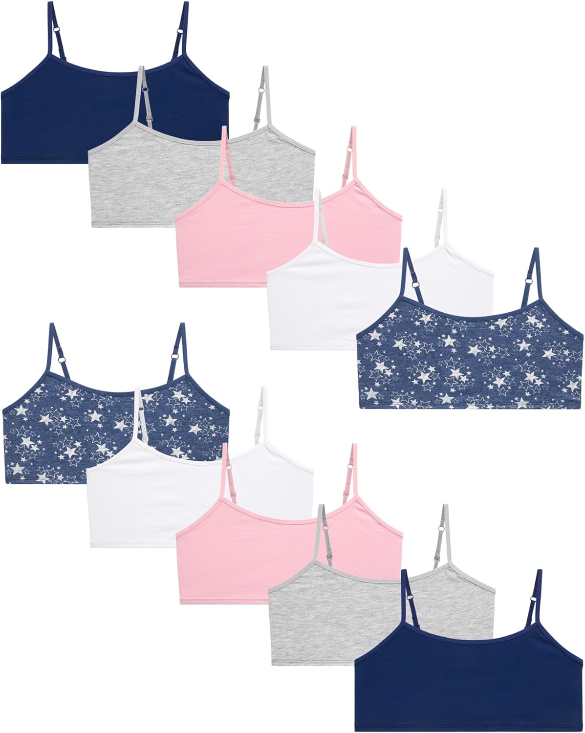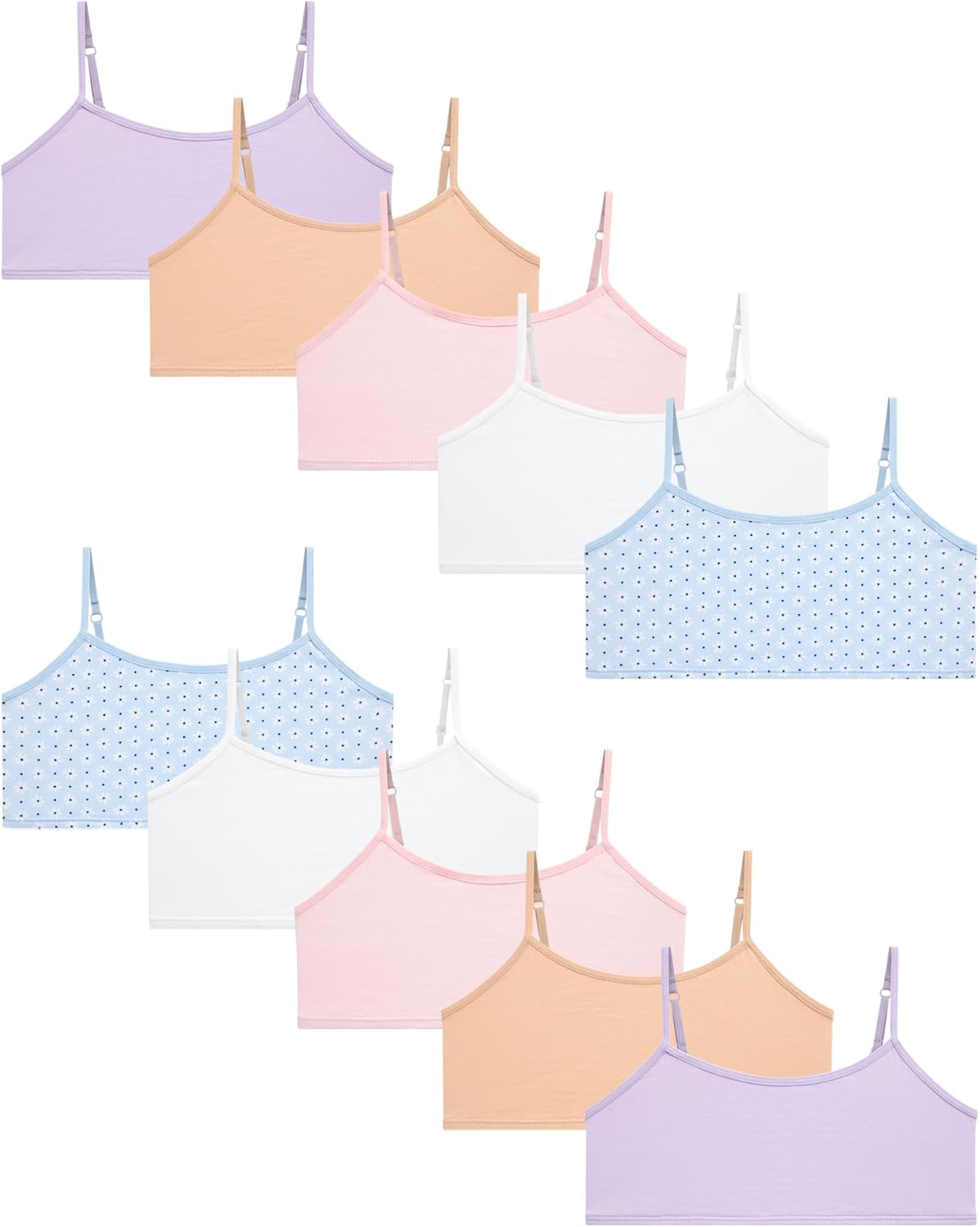 Help her feel confident and comfortable with the Rene Rofe Girls Training Bras - 10 Pack Soft Stretch Cotton Bra Cami Style Girls Underwear with Adjustable Straps. Designed for everyday comfort, these cotton bralette tops offer the perfect balance of softness and support for developing girls. Whether you're shopping for girls bras 10-12 years old, training bras for girls 7-8, or simply comfortable bras for tweens, this set delivers essentials you can count on. The pull-on, tag-free design with adjustable straps makes these bras ideal for layering under girls clothes, school uniforms, or preppy stuff for girls 10-12. These teen bras are perfect for lounging, running around, or sleeping, serving as a lightweight sleeping bra or active-ready running bra. You’ll love the soft four-way stretch and durable stitching that lets these girls training bras 8-10 years old move with her through every stage. With a variety of neutral and classic tones—including white bra, black bra, pink bralette, and nude bra—this bras pack ensures she has a bra for every outfit. Great for pairing with girls organic cotton underwear, girls undershirts, or as a backup in her backpack or gym bag, each kids bra is made for real life. Whether you need girls underwear size 8, girls underwear size 10, girls underwear size 12, or girls underwear size 14, this multi-size option provides long-lasting value and comfort. From first bras to pre-teen and teen girl underwear, this set is perfect for training bras for girls 10-12, strapless bra for teens 12-14 alternatives, or everyday girl underwear layering. A must-have for teen girl clothes, ropa de niña, and all-around teen apparel, these soft bras help her feel confident in her own skin.