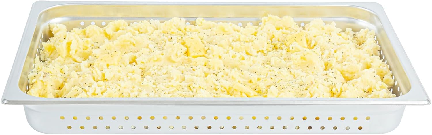 Enhance your kitchen efficiency with superior liquid drainage. The Kitchen Tek Perforated Hotel Pan features a perforated design that optimizes food preparation, ensuring faster service in busy settings. This full size steam table pan is equipped with an anti-jam stacking lug, providing stress-free serving even during peak hours, which is essential for maintaining smooth operations. Constructed from 24-gauge stainless steel, this pan withstands the demands of a bustling kitchen while its 20.8-inch length and 12.8-inch width offer ample space for versatile foodservice needs. The silver finish is dishwasher safe, oven safe, and freezer-safe, making it adaptable for both hot and cold food applications. Elevate your foodservice operations with this indispensable kitchen tool. Each order includes 1 Kitchen Tek Perforated Hotel Pan.