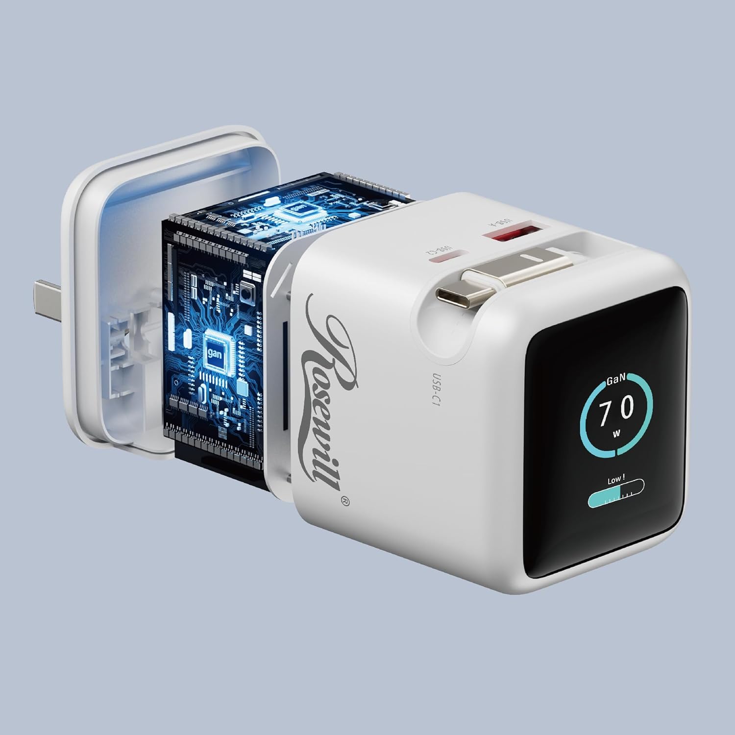 Rosewill 70W Retractable USB-C Wall Charger with Built-in Cable, 3-Port GaN 3 Fast Charging, Foldable Design & Real-Time TFT Display for MacBook, iPad, iPhone, Galaxy White