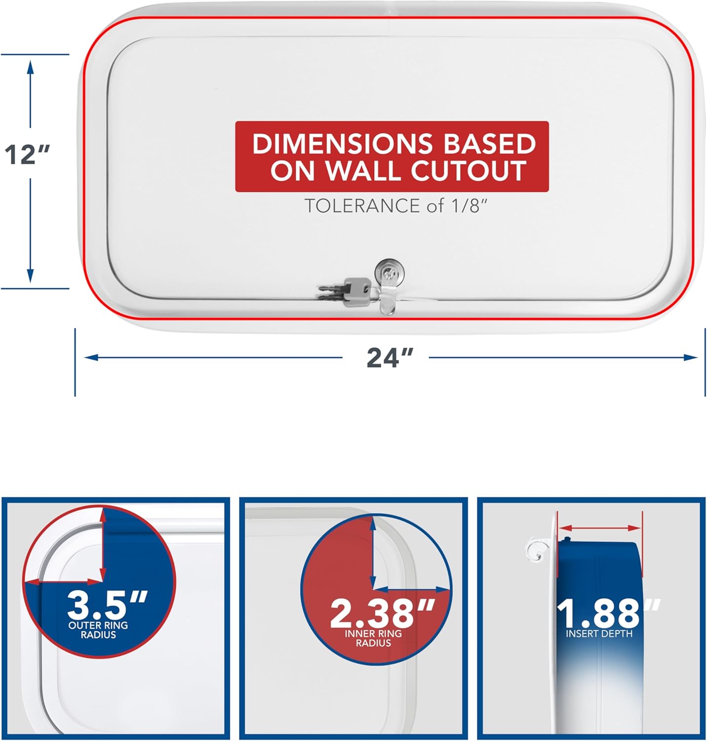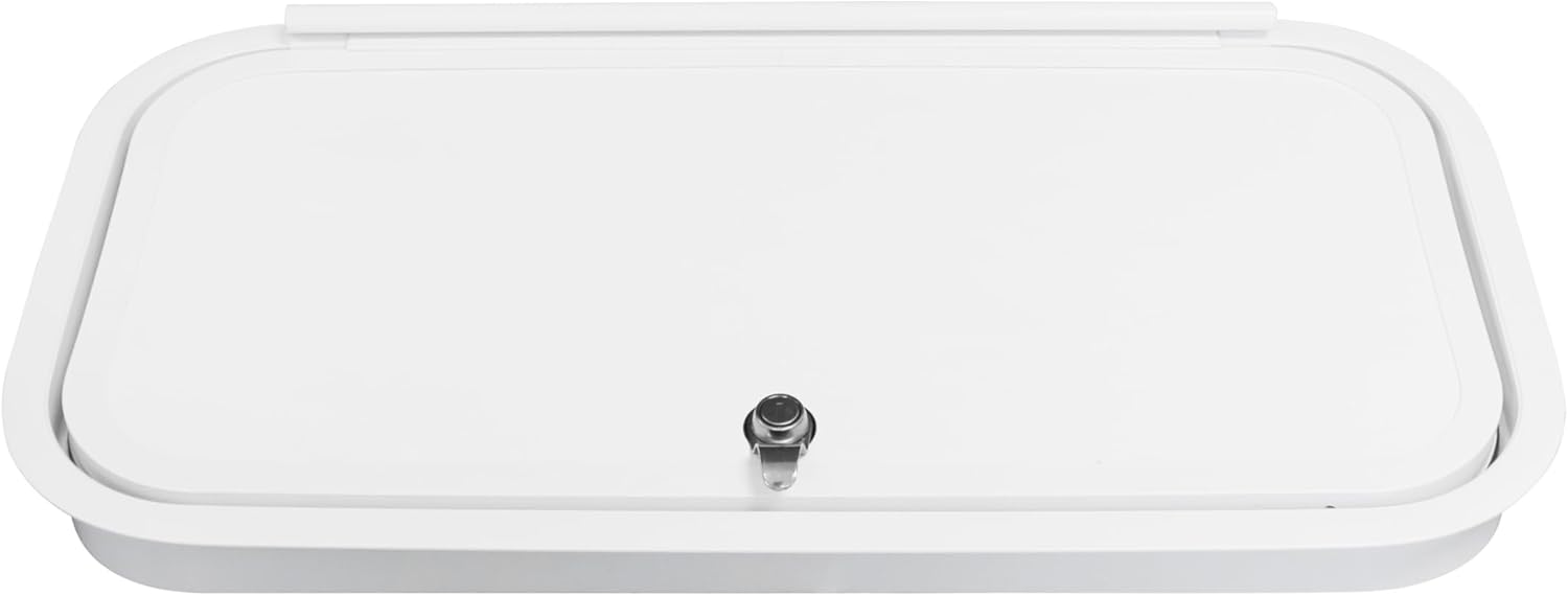 Brand New 24" x 12" RV Camper Trailer Fifth Wheel Baggage Storage Compartment Cargo Hatch Door 2" Thick door It has one key lock. Does include Key white aluminum frame & smooth white fiberglass door. Cutout size- 24" Wide x 12" Tall Overall size- 26" Wide x 14" Tall Frame thickness is 2" Color- white