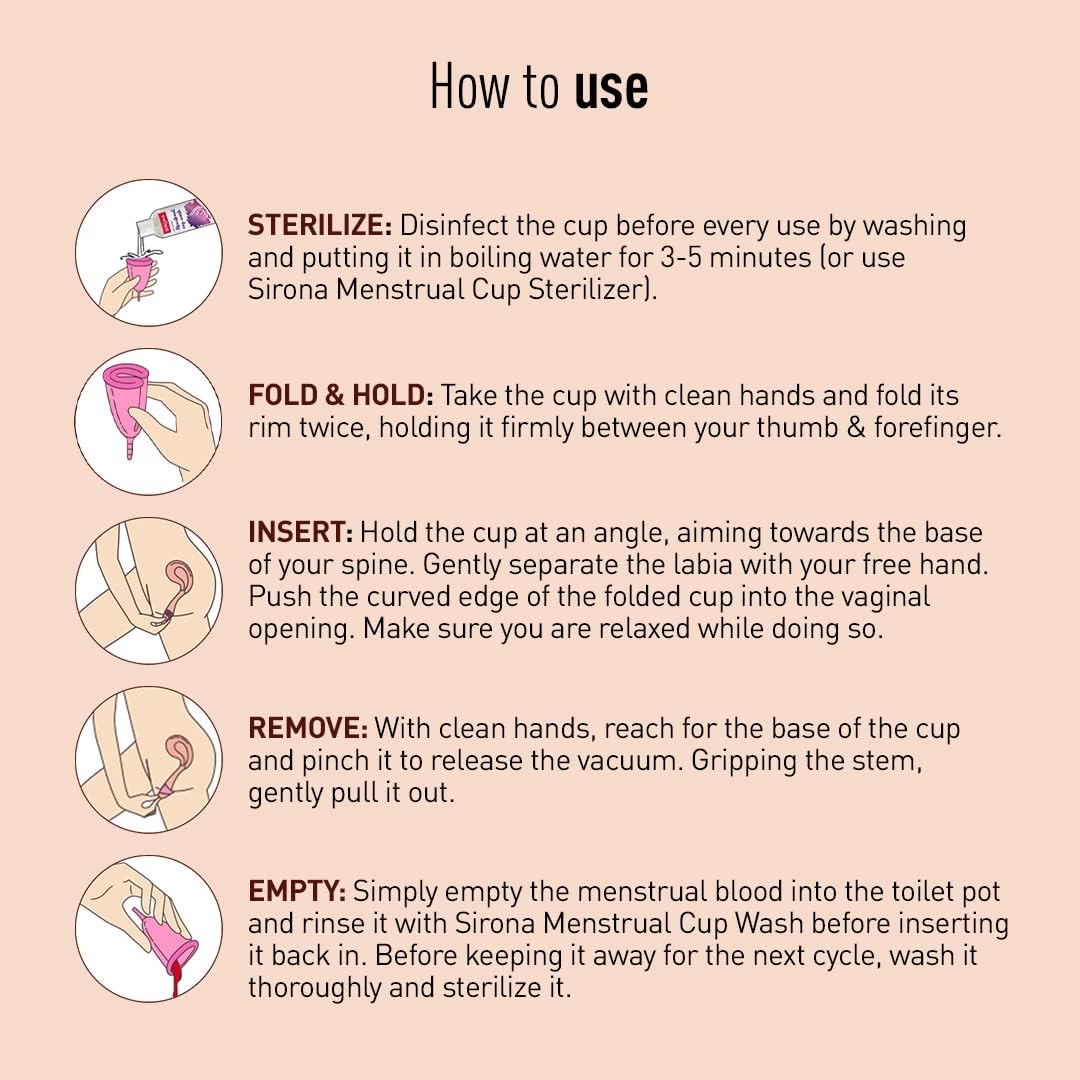 Sirona Menstrual Cup is the most modern, nature-friendly, economical and leak-free way of experiencing complete period comfort. It is a reusable, silicone cup that collects your menstrual flow rather than absorbing it. and is worn internally, like a tampon. It is ideal for those who care for their own health (cups don’t disrupt your natural pH) & the environment (disposal of sanitary products create toxic waste). Cups are made of high-quality medical-grade silicone that is widely applied in products such as infant nipples, catheters etc (it is toxin free, odourless & hypoallergenic). Thanks to its design, it is an ideal menstrual aid for swimming, all other kinds of sports, travelling and common daily chores! With Sirona’s Menstrual Cup you would always be prepared to take on your periods!