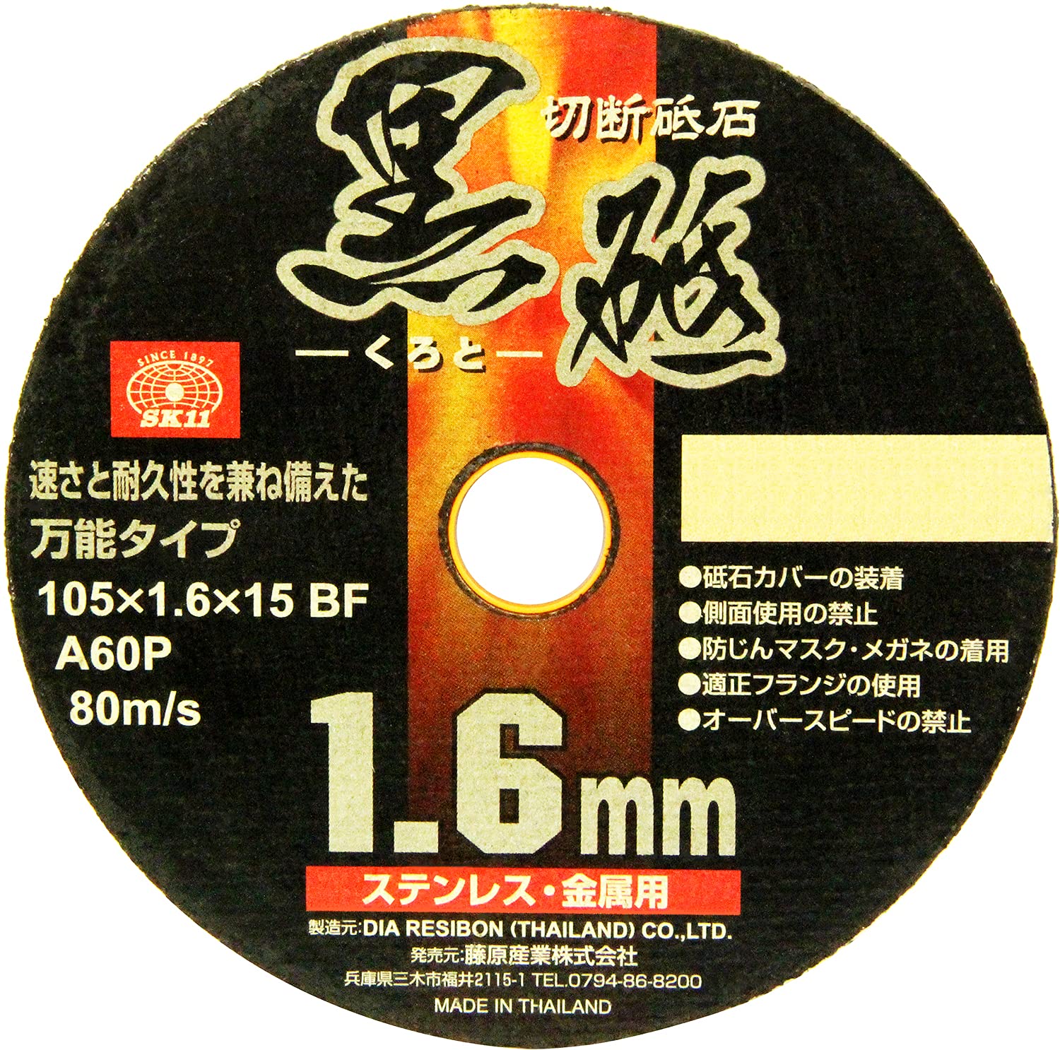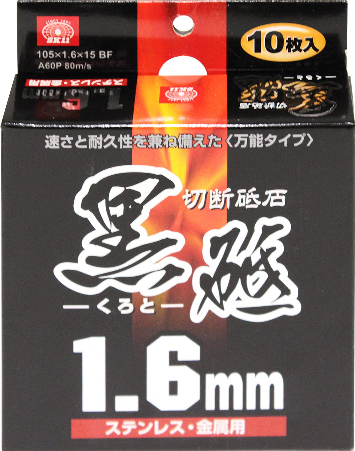 [Features] Cutting metal (iron) and stainless steel. 0.06 inch (1.6 mm) thickness provides a good balance of durability and speed. [Specifications] Outer Diameter: 4.1 inches (105 mm); Thickness: 0.06 inches (1.6 mm); Hole Diameter: 0.6 inches (15 mm); Granular Hardness: A60P; Maximum Perimeter Speed: 27.6 ft (80 m/s); Please wear dust mask, protective glasses *Please do not use appropriate brunge on the side of the whetstone.