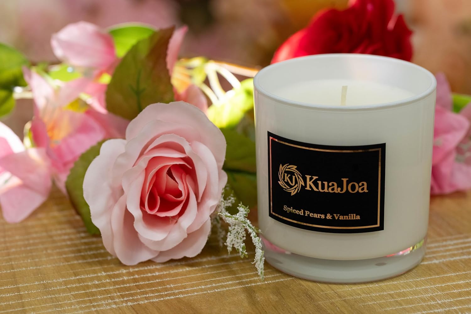 Transform your space with this elegant KuaJoa jar candle in Spiced Pears & Vanilla fragrance. The sophisticated blend of warm vanilla and juicy pear notes creates an inviting atmosphere that gently fills your room. Crafted with a premium wax blend, this candle offers up to 50 hours of consistent, clean-burning illumination. The sleek white glass vessel and classic black label design complement any décor style, from modern to traditional. Perfect for creating ambiance in your living room, bedroom, or bathroom, or as a thoughtful gift for any occasion. The candle features an even burn and excellent scent throw, making it ideal for both everyday use and special moments. Each candle comes elegantly packaged in a white gift box adorned with a luxurious black ribbon, ready for gifting or displaying in your own home.