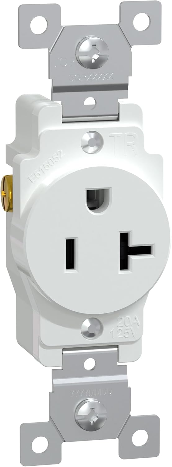 The Square D X Series 20A 125V Tamper Resistant Heavy Duty Single Outlet provides a fast, safe way to update the look of your home's interior with new, modern receptacles. Elevate safety with discrete, tamper resistant shutters that help keep inappropriate objects out of the socket. Enjoy a consistent look across your room or home with the full line of Square D X Series switches, dimmers, sensors, and receptacles. Complete the look with one of the Square D X Series cover plates (not provided) that easily snaps into place for a modern, flush-facing finish to your walls. Enjoy fast wiring with a grounding strap hole designed for speed wrapping installation. The outlet is commercial grade, ideal for devices that stay plugged in. Its Ue rated operational voltage is 125VAC. Its Ie rated operational current is 20A.