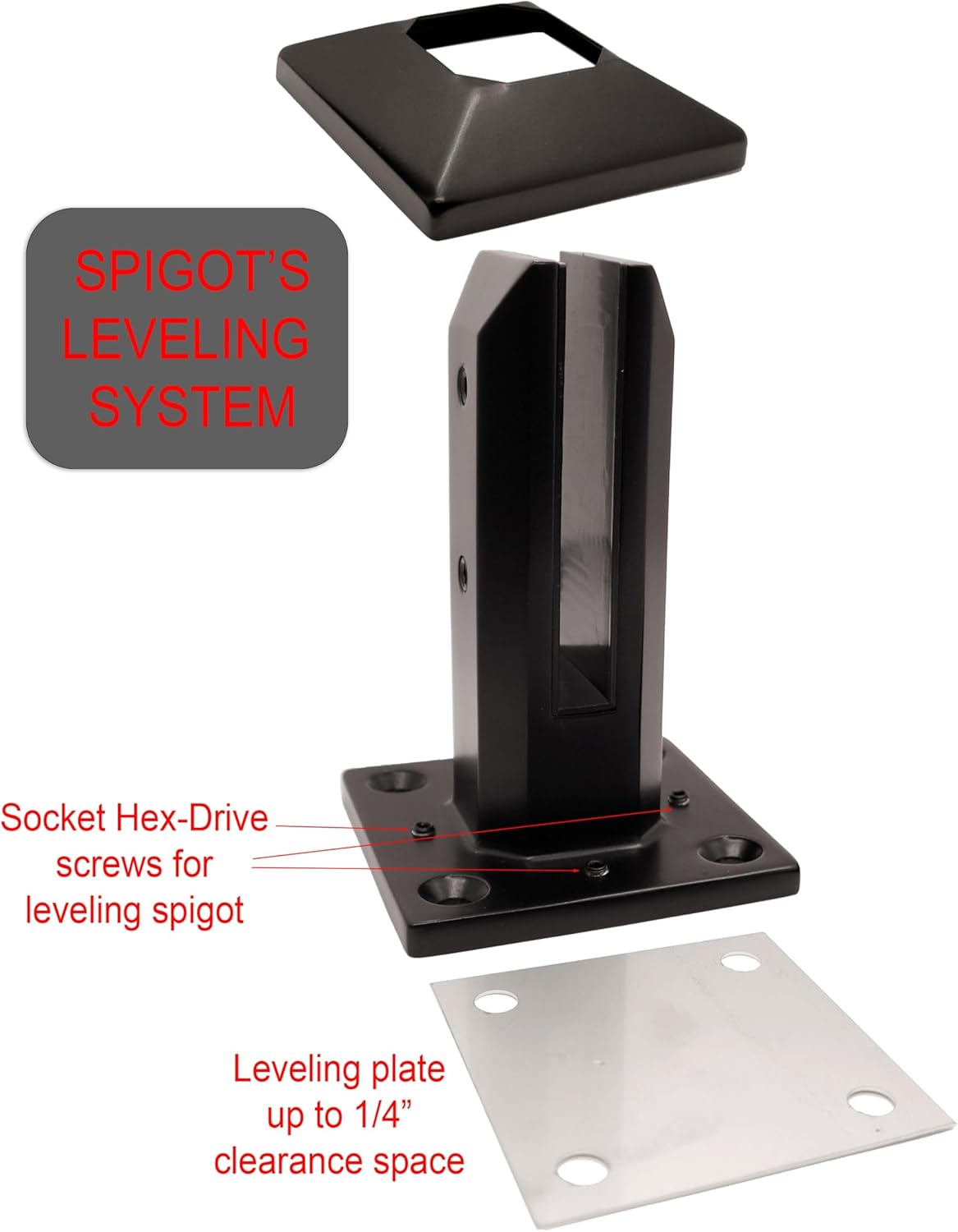 Heavy Duty 316 Stainless Steel Glass Fence Balustrade Railing Post for Balcony/Garden Deck Handrail (1 PCS) 316 grade black stainless steel has excellent corrosion resistance and high strength qualities. The spigot is resistant to salt corrosion and therefore ideal for salt-water swimming pools, beach areas and coastal homes. Features: Suitable for 3/8" (10mm) or 1/2" (12mm) tempered glass panels Black matte finished. This is a 6" tall spigot. No Holes required for glass panels Easy installation Easy to clean. Free Maintenance A package includes 1 clamp, 1 cover plate, 1 aligment plate, 2 screws for holding the glass Weight 3.6lb. This spigot railing post has been designed to incorporate a highly polished look with sophistication and elegance that will enhance your area. It has been designed with safety for your area as a priority. It has tapered edges eliminating footholds. It is capable of being deck mounted or core drilled into paving. It has no pins through the glass and has a clamp action on the glass with the ability to adjust whenever required. If the glass is accidentally broken there is no need to remove the post. Preparation costs are minimized with the no need for a channel in the concrete when installing the glass. Because the glass is elevated from the paving or decking water and debris can flow underneath it, scum won’t build up on the bottom of the glass and the glass can not get scratched when cleaning. Modem effective solution to your fencing needs.