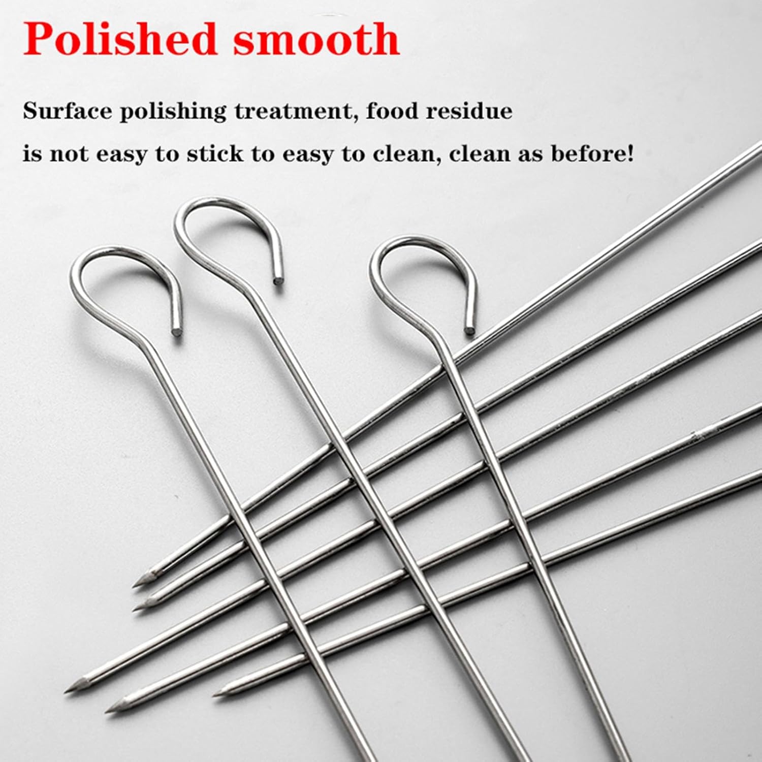 Can be used with beef, fish, pork, carrots, onionsMetal shish kabab skewer is of solid one-piece design. The bbq kabob sticks is thick enough, allowing you put more weight on each skewer without getting bent or twisted.Stainless steel barbecue skewers allow for complete rotation so the food can be evenly heated and seasoned on all sides.Ergonomic Handle DesignBBQ skewers are simple and beautiful, comfortable grip, non-slip, barbecue more convenient, easy to clean. Applicable PlaceBBQ, camping, pool side grill, take them to parks, outdoor recreation, road trips and more.Note: Due to manual measurement, please allow small size errors, thank you for your understandingChromatic aberration occurs due to different light, shooting angles and monitors. Please refer to the actual product received.Steel stick polishing Xiao tip will leave a small amount of steel powder, just wash with water before use.