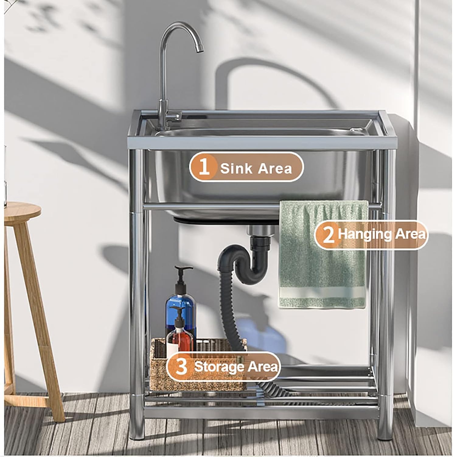 Stainless Steel Utility Sink Free Standing Sink Commercial with Storage Shelve Laundry tub w/Cold and Hot Water Pipe Faucet and Drainer Unit for Room Garage BasemenOutdoor and Indoor.Product Description: The Commercial Sinks Basin Is Integrally Formed By Gravity Stamping, And Welding Is Refused To Avoid Problems Such As Water Leakage And Peeling In The Future. Outdoor Catering Sink Are Widely Used. Whether It Is An Indoor Family Or An Outdoor Picnic, It Is An Ideal Choice For A Clean Meal. Product features:1.This free-standing commercial sink is perfect for any dining environment. Deepen the large troughs, pots and pans and wash them together to effectively improve the efficiency of the kitchen. 2.Our utility sink is designed for stability and durability. The freestanding unit is supported by a sturdy frame, ensuring a secure and wobble-free experience. 3.The faucet provides easy access to water for all your cleaning and washing needs. Additionally, the sink is equipped with storage shelves, allowing you to keep your cleaning supplies, tools, and other essentials neatly organized and within reach.4.Our sink features a high splash guard to prevent the back drywall from getting wet, and a large drainage hole for efficient water drainage. 5.The stainless steel structure is easy to keep clean, and the spacious drain pipe provides you with enough drying space. 6.It is an ideal washing and pre-washing sink, suitable for any kitchen, bar, restaurant, laundry room, clean room, cafeteria, garage or other commercial environment. Product Specifications: Product Name: Commercial Stainless Steel Sink Product Material: Non-magnetic Stainless Steel Product Process: Wire Drawing Process (non-stick Oil) Overall Product Size: 47x42x80cm , 55x44x80cm , 65x50x80cmNote: All Dimensions Are Manually Measured, There May Be Some Errors in Deviation, Please Refer to the Actual Product!