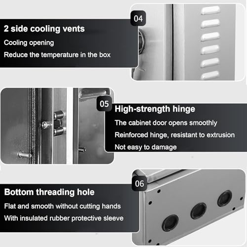 Introducing our Stainless Steel Electrical Enclosure Box, designed for outdoor use and engineered to protect your essential electrical equipment. Crafted from thick stainless steel, this floor-mounted junction cabinet is built to withstand the elements, featuring an impressive IP65 rating that ensures reliable waterproof and dustproof performance. This robust enclosure is perfect for various applications, including solar panel wiring in your backyard, safeguarding control systems at factories, supporting temporary power installations at construction sites, and managing outdoor lighting or HVAC controls in both commercial and residential projects. Our enclosure is equipped with a thickened sealing strip that effectively blocks water and dust, ensuring your equipment stays protected under challenging weather conditions. The strategically placed side cooling holes enhance air circulation, allowing for quick heat dissipation and preventing overheating, which is crucial for maintaining optimal performance. Wiring is made simple with the integrated threading holes, complete with insulating sleeves that not only streamline the process but also offer added protection for your cables. The high-strength hinge and reinforced lock provide easy access to your equipment while ensuring long-term reliability and security. For added convenience, the detachable backplane allows for straightforward installation, making it an ideal choice for both professional and DIY projects. Elevate your outdoor electrical setups with our weatherproof junction box, where durability meets functionality.