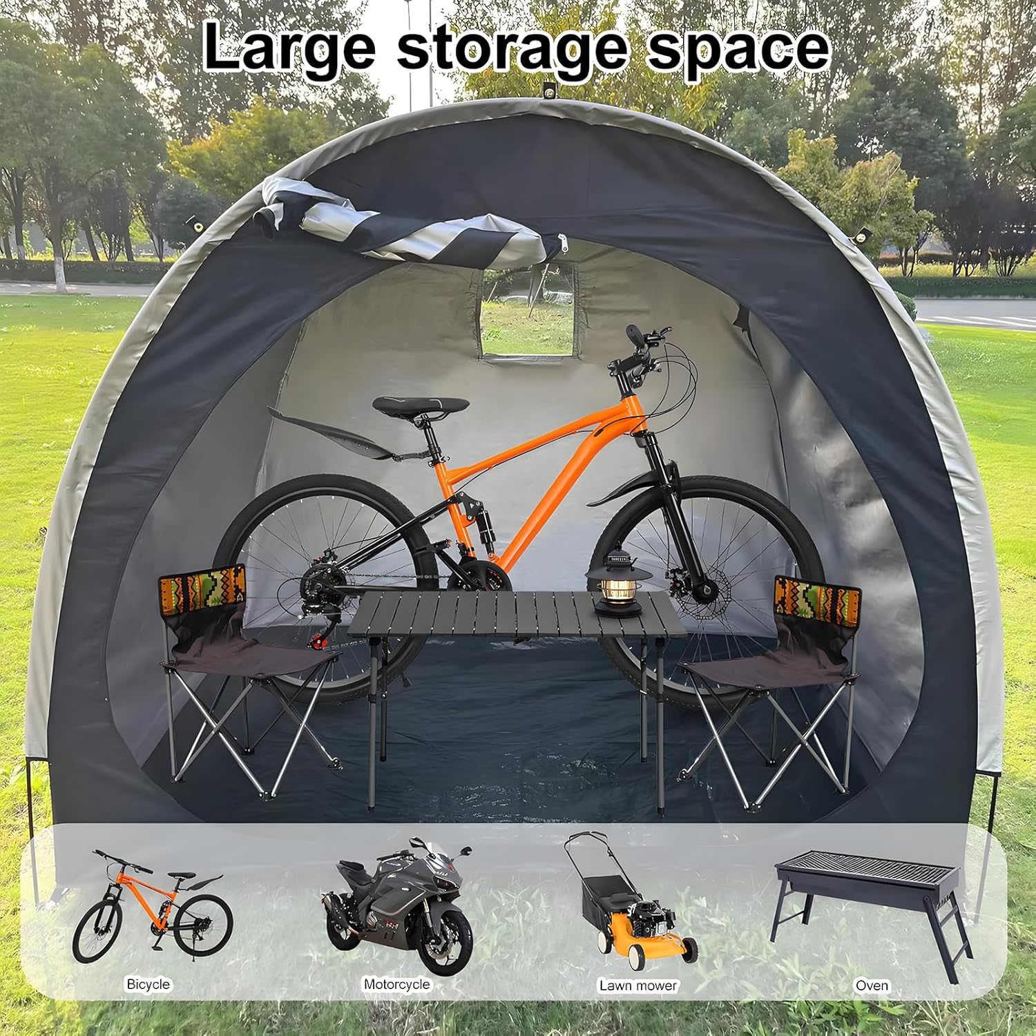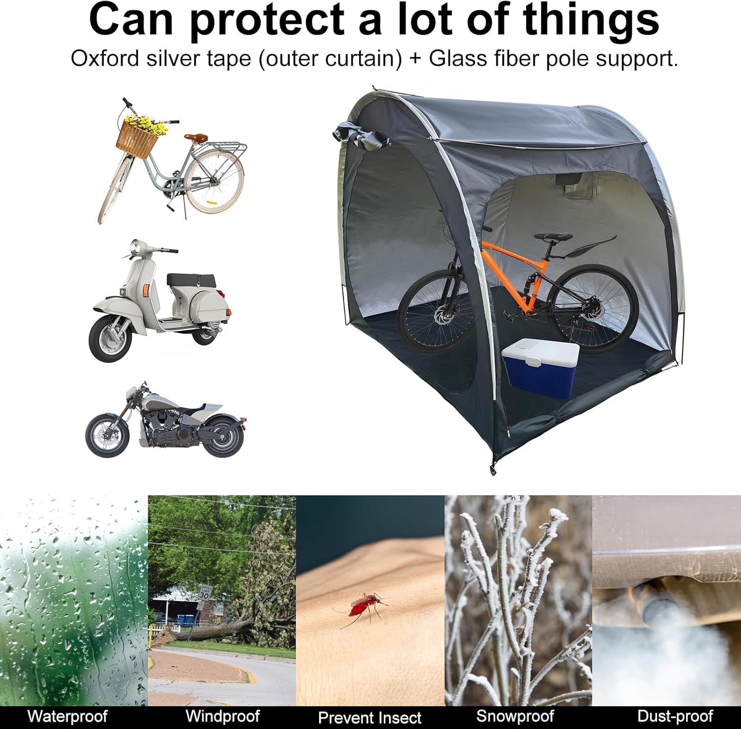 DescriptionsItem Name: Bike Tent Material: Oxford Silver Tape, Fiberglass PoleCapacity: 2-4 Bikes Features: Widened Double Doors, Smooth Two-way Zipper, Waterproof Size Details:L: 195cm/76.77", W: 165cm/64.96", H: 145cm/57.09" (Approx.)Notes:Due to the light and screen setting difference, the item's color may be slightly different from the pictures.Please allow slight dimension difference due to different manual measurement.Package Includes:1 x Bike Tent