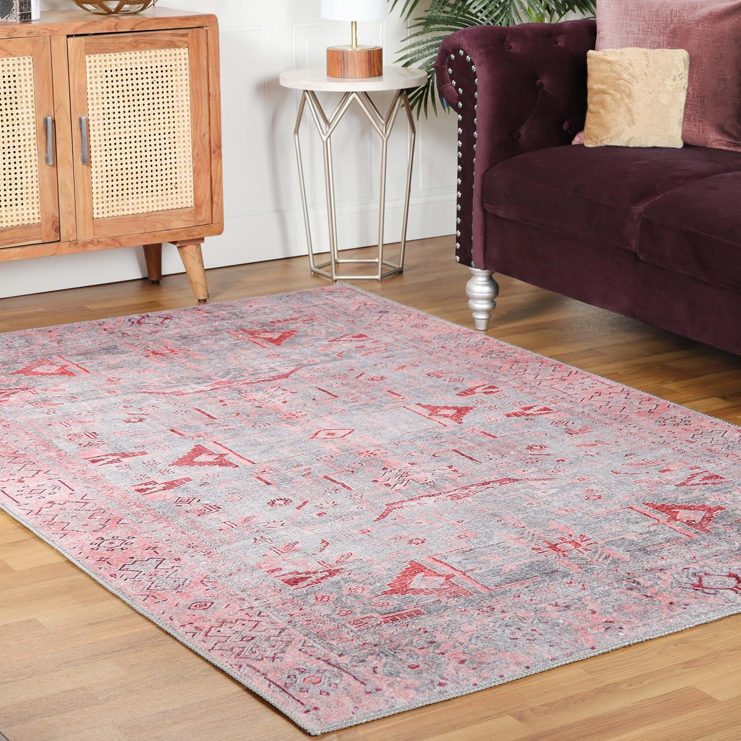 The Uma Area Rug displays an antiqued look that elevates the look of your tile or hardwood floors. This gorgeous flat-weave rug is made from premium, hard-wearing Polyester fibers that are stain, fade, and wrinkle free and is complete with a strong Cotton canvas backing that can be rolled for effortless storage. Uma withstands high-traffic homes with children and pets while feeling incredibly soft underfoot. This rug comes in rich shades of berry red or charcoal and boasts a faded traditional floral and border pattern that adds a dramatic appearance to your living room, office or bedroom. Enjoy long-lasting style and comfort with this elegant, vintage-inspired rug.