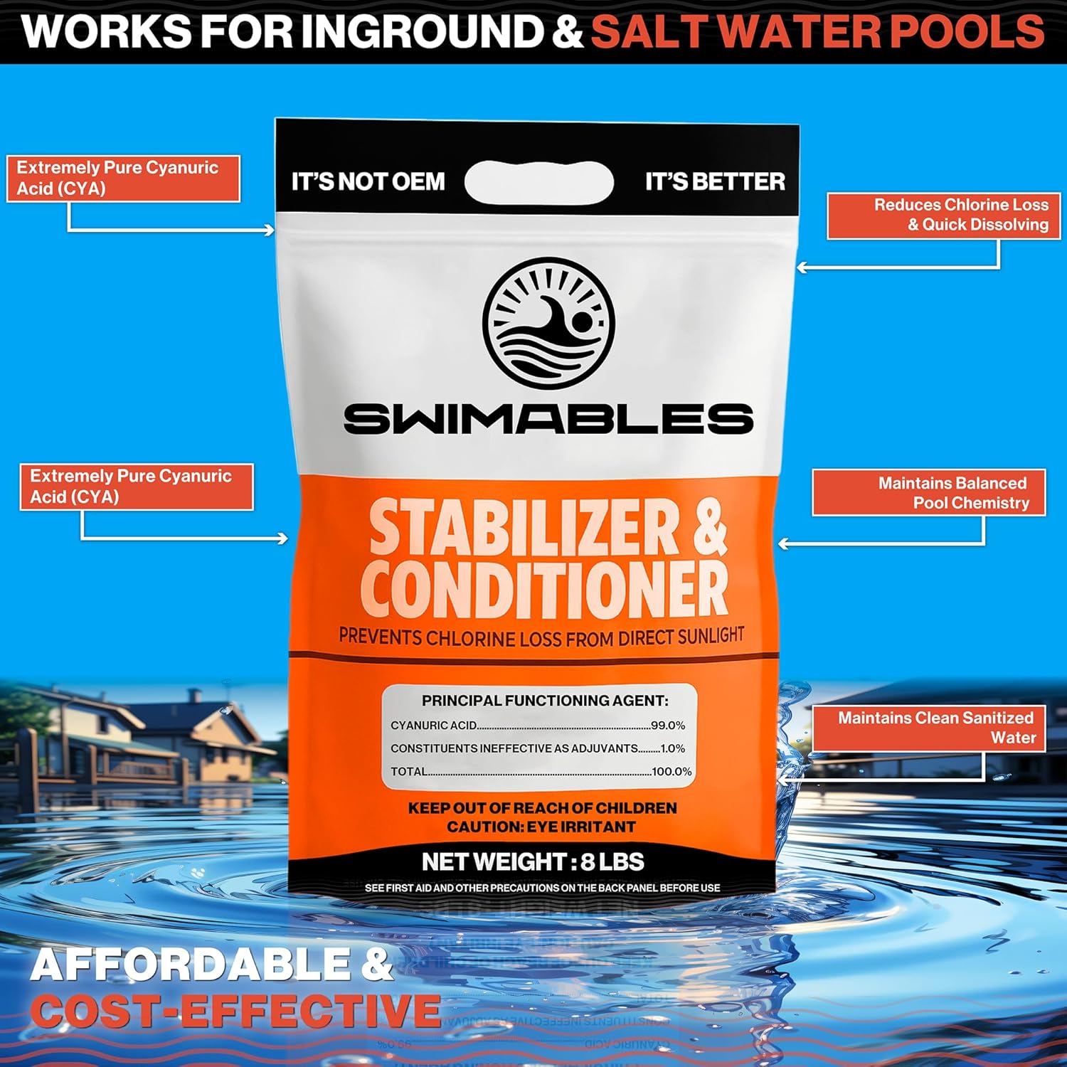 Quick Dissolving: Our pool stabilizer for chlorine pool dissolves quickly, allowing faster chlorine protection. Remember to apply a small cupful at a time of our pool conditioner for saltwater pool. Affordable: Not only is our product the best stabilizer cyanuric acid for pools, it is also very affordable to the average consumer. No more having to pay an arm and a leg for pool chlorine stabilizer. Works Great On Inground Pools: This stabilizer for pool water conditioner is an excellent way to prevent Chlorine loss in inground pools making it a versatile addition to any pool care routine. Reduce Chlorine Loss: Our conditioner for pool protects chlorine from being degraded by sunlight, preventing chlorine loss caused by the sun's UV rays. Crystal Clear Pool: Swimables Stabilizer for Pools is designed to help keep your pool crystal clear throughout the summer season. Buy with confidence, buy Swimables. Ideal for Salt Pools: Our Chlorine Stabilizer is specially designed for saltwater pools, providing dependable protection against the sunlight’s corrosive impact on chlorine produced by salt cells. Protects Pool & Equipment: Unbalanced water can create a corrosive environment that harms your pool surfaces and equipment. This product helps maintain water balance and reduces.