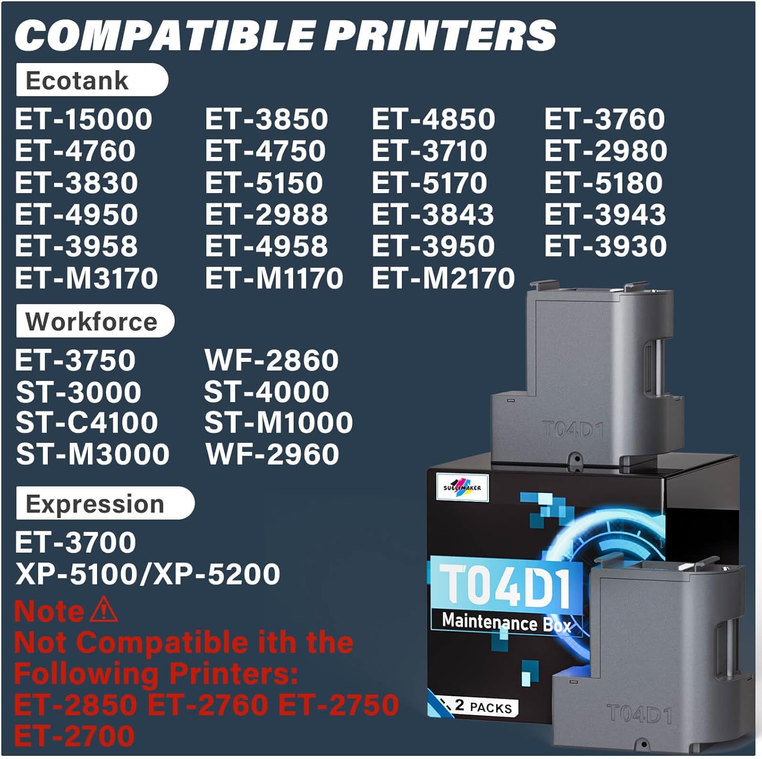 | Compatibility Options | T04D1 Ink Maintenance Box Compatible Replacement for Epson Eco Tank ET15000 ET3850 ET4850 ET3760 ET4760 ET4750 ET3750 ET3710 ET2980 ET3830 ET5150 ET5170 ET5180 ET4950 ET3700 ET2988 ET3843 ET3943 ET3958 ET4958 ET3950 ET3930 XP5200 XP5100 ETM3170 ETM1170 ETM2170 STM1000 STM3000 ST4000 ST3000 STC4100 WF2860 WF2960 Printer |