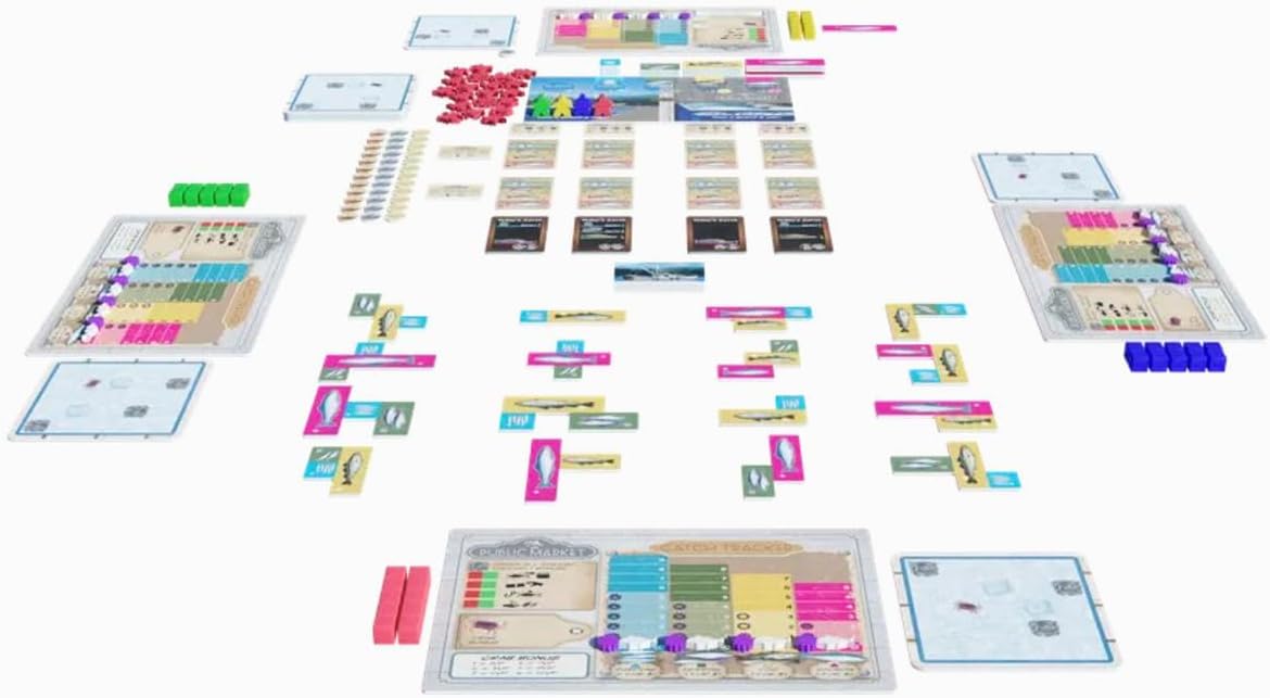 Head out to sea and fish to fulfill contracts in order to gain points and emerge as the winner in this tile-laying, engine-building game.In Public Market, players bid on and draft tiles to play into an ice chest. Once the ice chest is full, players can go to the market to sell their latest catch based on the current market values and to complete contract goals. They then get a new ice chest and go back out on the open water to fulfill new contracts. Play continues until the ocean bag is empty.
