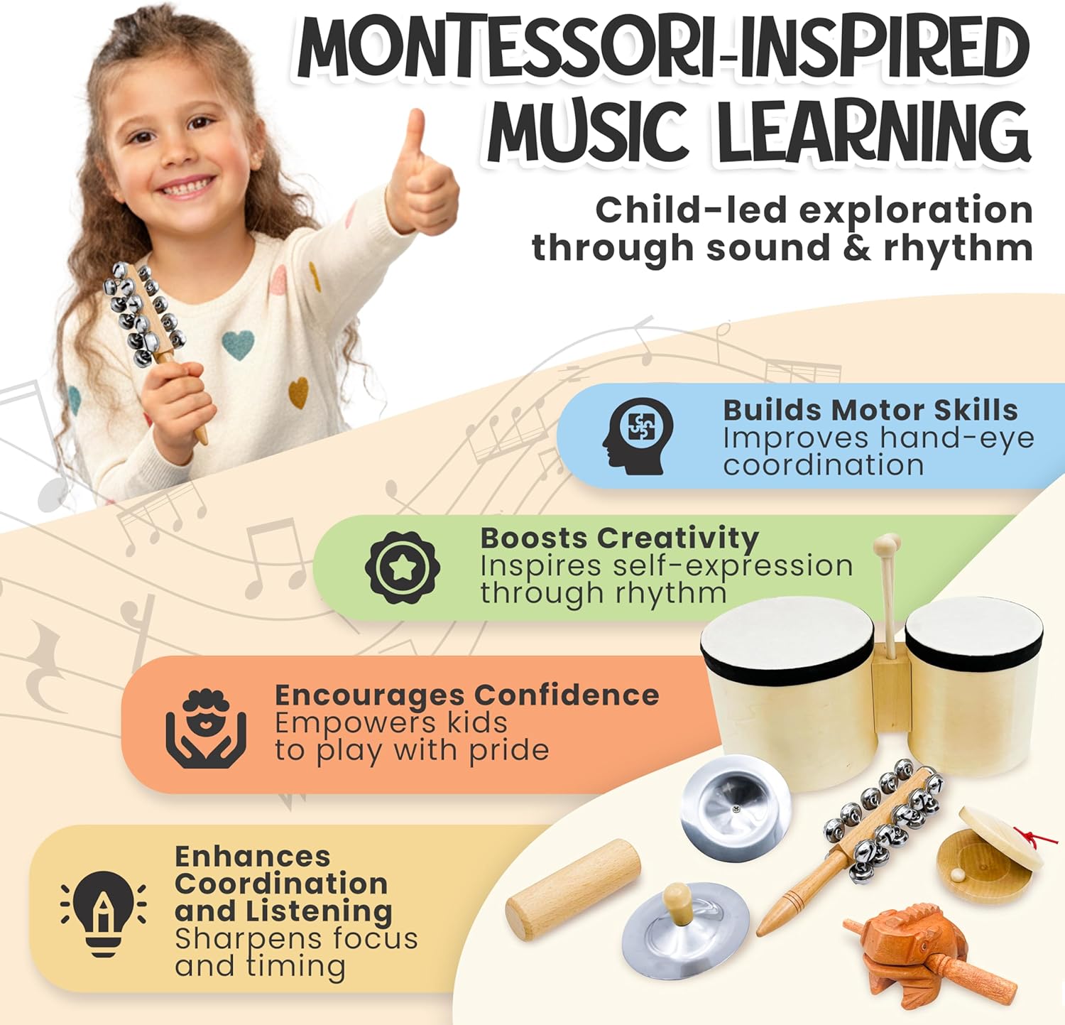 | Educational Objective | Introduce toddlers to music, rhythm, and sound through hands-on play; support Montessori principles; encourage sensory development, fine motor skills, and creativity; develop key developmental skills |
