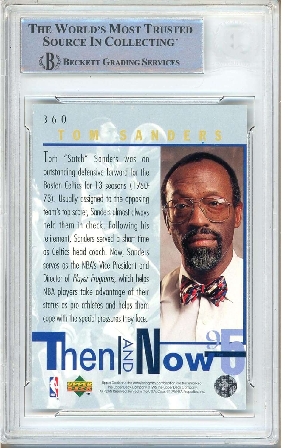 Add a classic Celtics collectible to your collection with this Tom Satch Sanders Signed and Autographed 1994 1995 Upper Deck Then and Now release. This is a Basketball Trading Card Slabbed for display and long-term collecting, featuring Sanders from his Boston Celtics NBA legacy and ideal for vintage sports card fans. The autograph is authenticated by Beckett BAS, and the card is secured in an encapsulated slab protective holder for clean presentation. For buyer confidence, the authentication number shown in photos and verifiable in the Beckett database. This retro then now insert style card fits perfectly in a card collection focused on Celtics memorabilia, basketball memorabilia, and authenticated autograph items. Display it as a display ready centerpiece in a display case, desk display, or office display, or feature it in a man cave or fan cave setup.