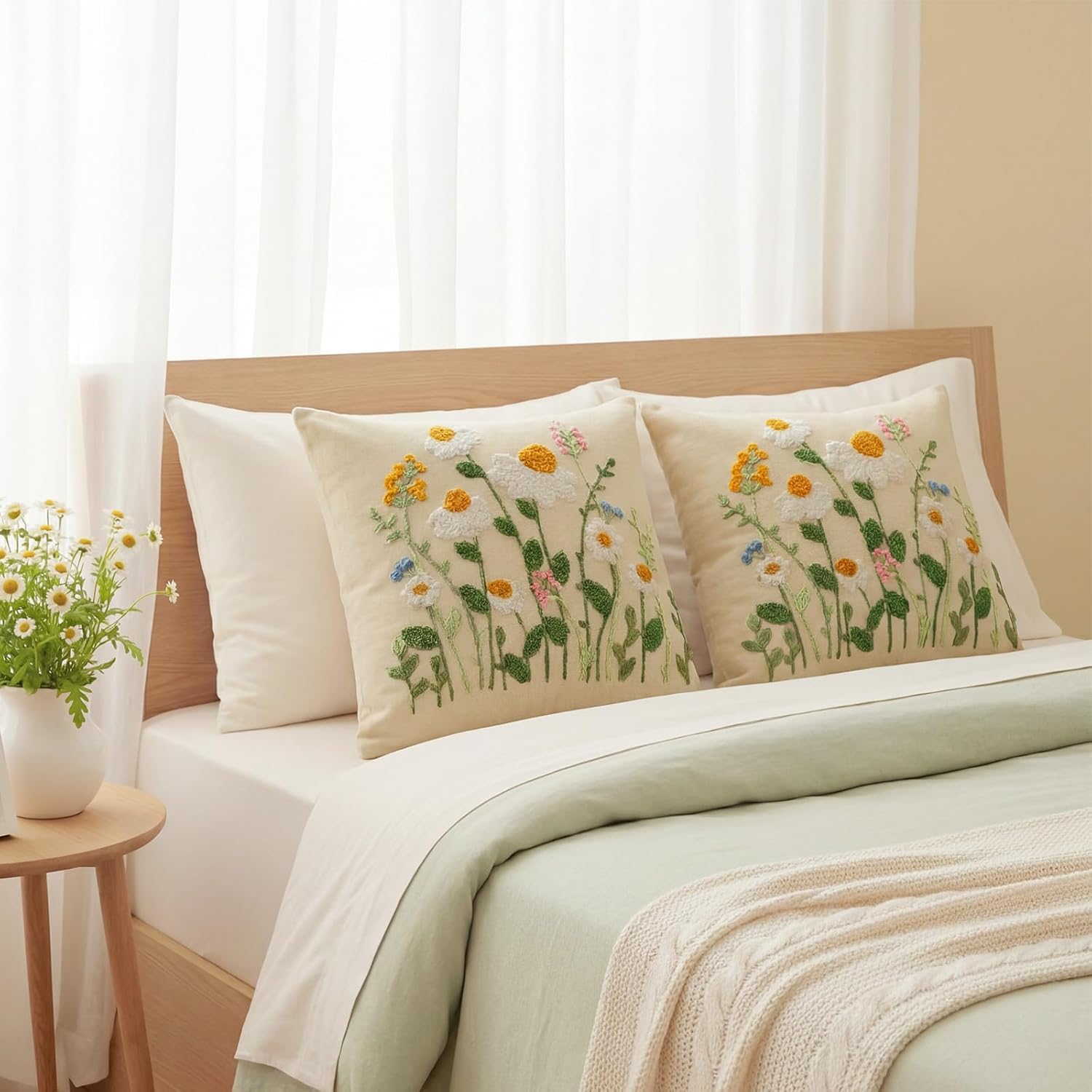 Features: Practical and Beautiful Pillow Covers: This 2 pcs set of daisy pillow covers not only enhances the beauty of your home but also meets your daily decoration needs. It's a good gift choice for spring gatherings, summer holidays, or housewarmings, bringing joy and warmth to friends and family and conveying a comfortable and happy lifestyle. Gift choice, conveying warmth and thoughtfulness: The spring daisy pillow cases are not only practical and beautiful, but also a good gift option. Whether for spring gatherings, summer holidays, housewarmings, birthdays, or other festive occasions, it brings a warm and comfortable home atmosphere to your loved ones. Specifications: Material: polyester Color: white Size: 20 x 20 inches/ 45 x 45 cm Package includes: 2 x Daisy embroidered pillow cover Notes: Manual measurement, please allow slight errors on size. The color may exist a slight difference due to different screen displays. Pillow case only, no pillow insert