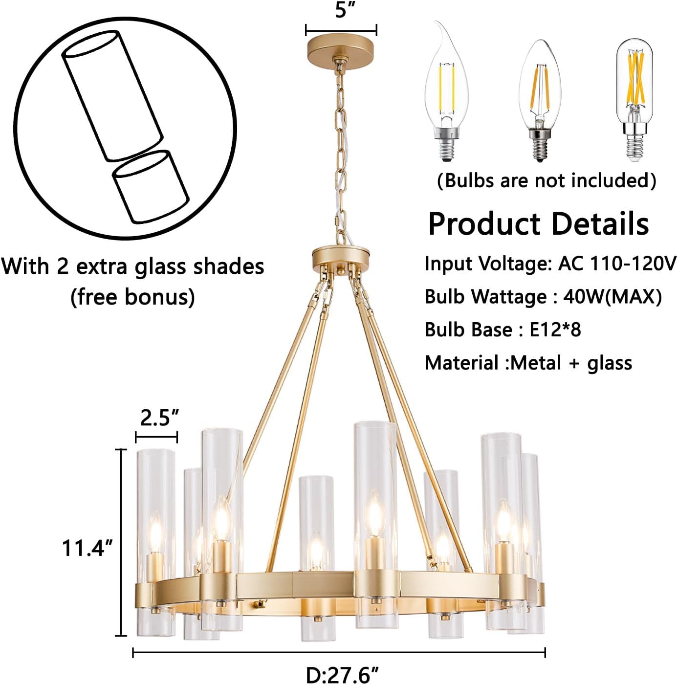 | Color | Gold 8 Light + Glass Shape |