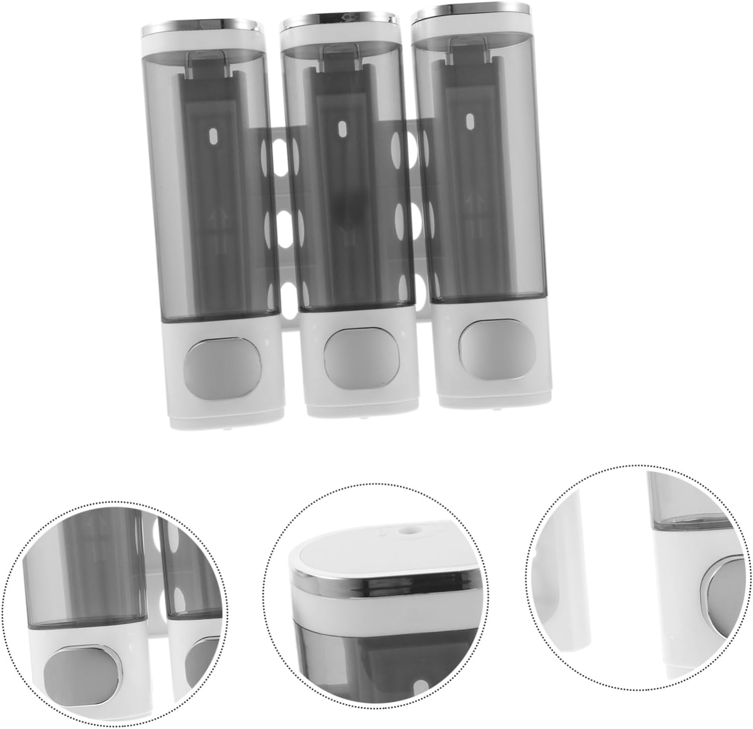 Package List 1 x 3-in-1 soap dispenser 4 x install screws 4 x expansion bolts Characteristics -Color:White -Material:ABS -Size:21.50X21.00X7.00cm/8.45X8.25X2.75in -Product Info:Soap liquid box - It is made with excellent craftsmanship, easy to install, convenient and practical, and will serve you well wall mount soap dispenser. - It has a wide range of uses and can be used in homes or hotels, etc., and is very practical shower dispenser no drill. - Wall-mounted installation is simple and efficient, which saves space and makes your bathroom look neater bathroom soap dispensers. - Reasonable design, press-type access, convenient and easy, can bring you a more comfortable bath time soap dispenser for shower wall. - Our wall soap dispenser is suitable for restaurant, homes, offices, dorm, hotels, shopping mall, etc bathroom soap dispenser.Goods Descriptionshampoo dispenser pump This product is a Soap Dispenser with a wall-mounted design, which is easy to install and easy to use, which can better help you save space and bring convenience to your washing work.shower dispenser no will not be easily damaged or broken, and will bring you a better experience