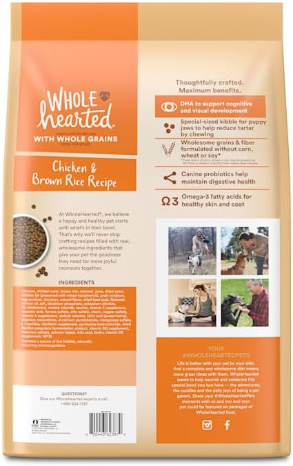 The WholeHearted Whole Grains Large Breed Puppy Chicken Dry Dog Food dishes out vitamins, minerals, probiotics, antioxidants, and Omega3 fatty acids in a taste that pups love. Feel good about what you're feeding your pet with the complete, balanced nutrition this formula provides.