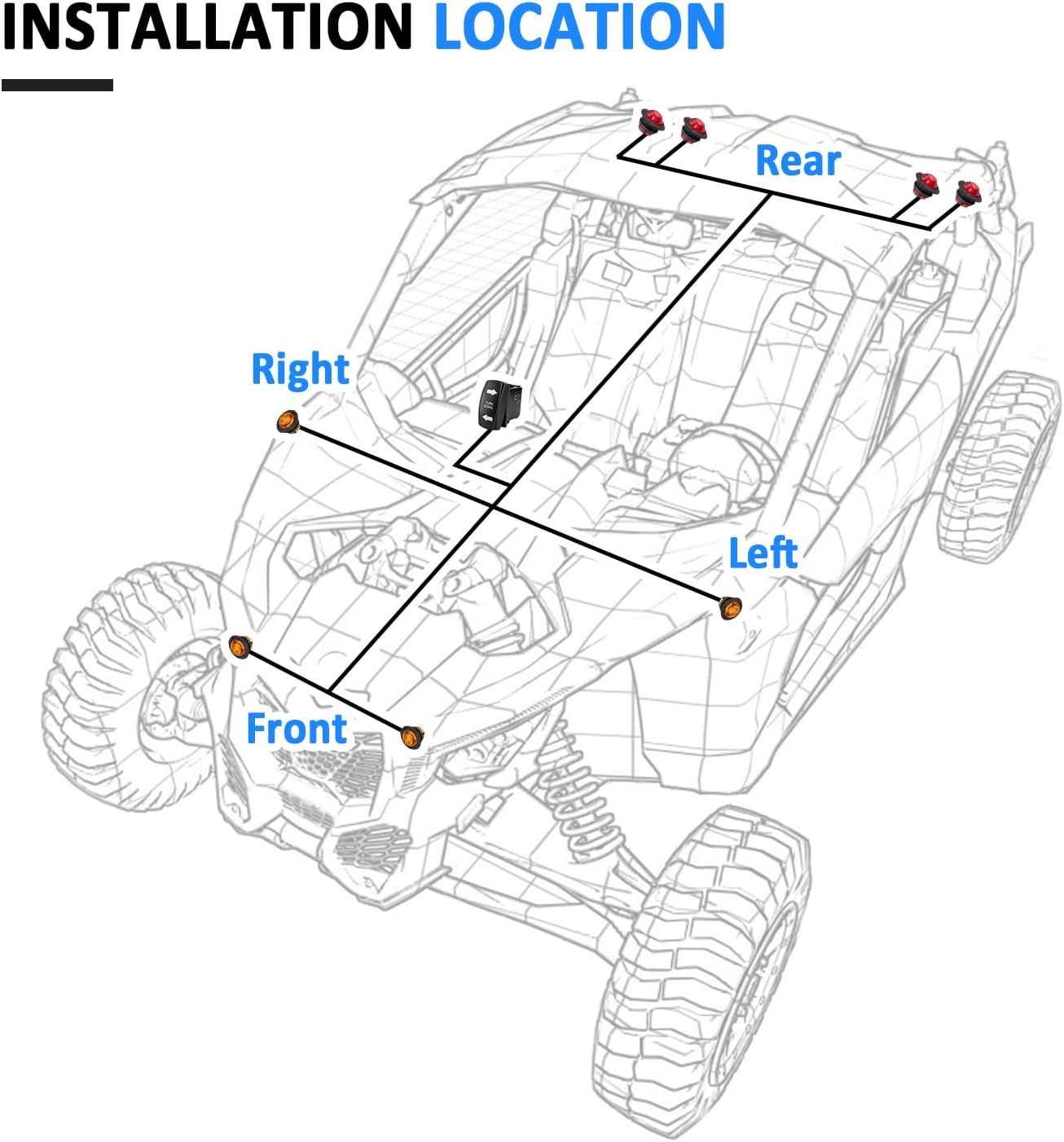 Fitment: Compatible with Can Am FIT Maverick X3 2017-2025 FIT Maverick X3 Max 2017-2025 FIT Maverick R 2024-2025 FIT Maverick R Max 2025-2025 Specification: Type:1 TO 4 Key-on Design:Yes Wire Gauge: 20 AWG Operating Voltage: 12-24V DC Load Capacity:Up to 120W Rocker Switch:4-pin,12V 20A and 24V 10A DC Logo:Turn Signal Switch Light:Blue Fuse:10A Blade Fuse Relay:DC12V 40A