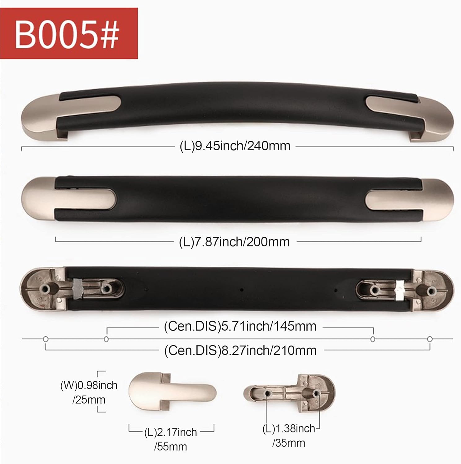 Specifications: Material: Zinc Alloy, PVC, Steel Color: Black, Silver Size: Total length: 24cm/9.44 inches Handle length: 20cm/7.87 inches Inner hole distance: 14.5cm/5.7 inches Outer hole distance: 21cm/8.26 inches Metal mount size: 2.5x5.5cm/0.98x2.16 inches (WxL) Hole distance: 3.5cm/1.37 inch Weight: 126g Package include: 1 x Handle 2 x Metal Mount 2 x Plastic Mount 4 x Screw Washer 4 x Screw Feature: 1.It is made of high-quality zinc alloy, PVC and steel sheet, and the zinc alloy structure ensures quality and service life. 2.Built-in steel sheet, ergonomics, frosted feel, and surface covered with oxide film, which makes the surface corrosion-resistant, comfortable to grip, and further improved abrasion resistance. 3.This luggage handle has screws and screw washers for easy installation. 4.It can be widely used in suitcase carrying handles, universal carrying handles, gift boxes, etc. It is an important repair and replacement part to repair damaged handles. 5.The total length 24cm/9.44 inch, handle length: 20cm/7.87 inch. Inner hole distance: 14.5cm/5.7 inch, outer hole distance: 21cm/8.26 inch. Metal mount size: 2.5x5.5cm/ 0.98x2.16 inch(WxL), hole distance: 3.5cm/1.37 inch. Before order, please check the size picture if suitable for your suitcase.
