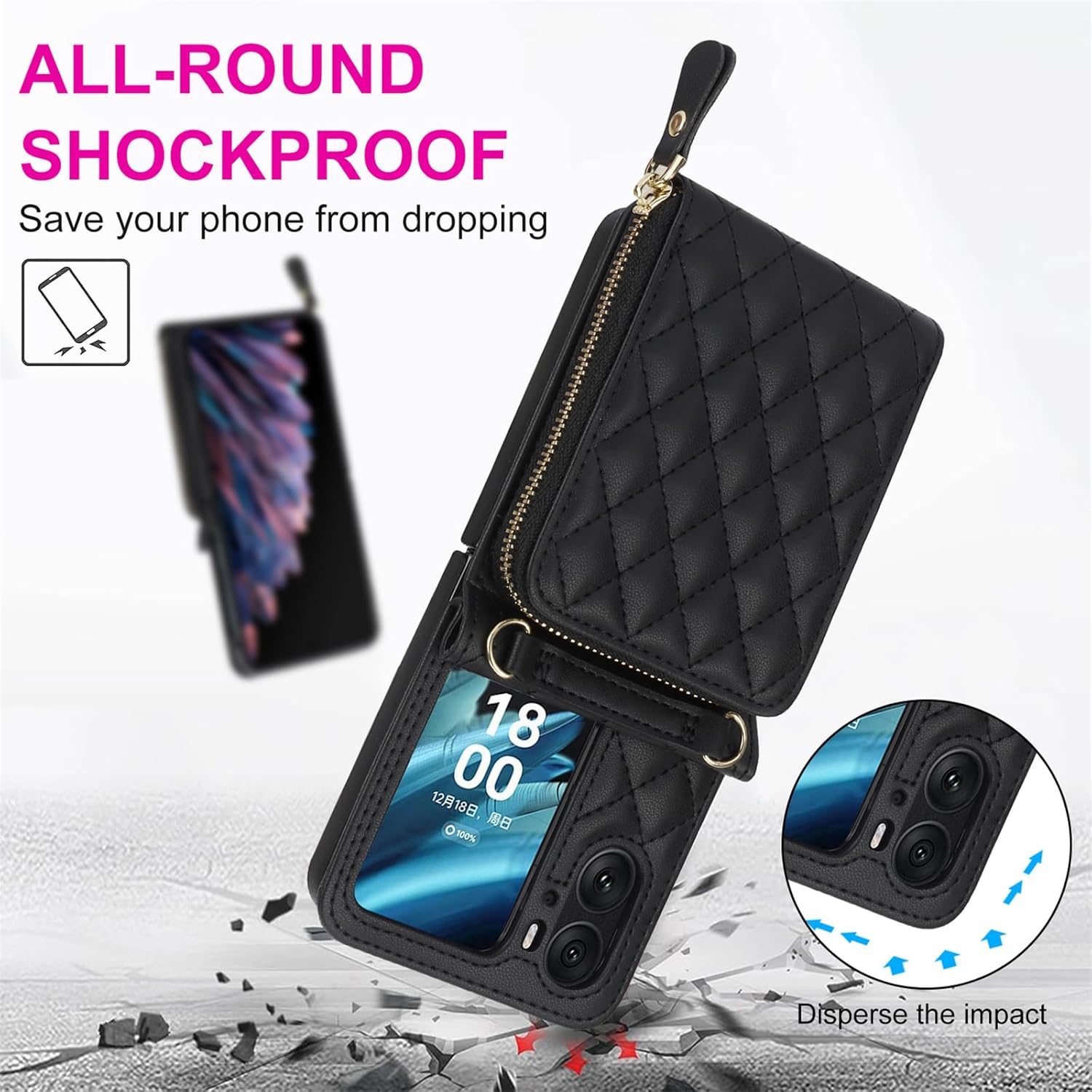 XYX Case for Oppo Find N2 Flip with Card Holder, Zipper Leather Accordion Purse Cover Case with Wrist Strap Crossbody Lanyard,Oppo Find N2 Flip 5G Case for Women - Black Product Features:The lanyard can be used as a necklace lanyard strap or as a shoulder belt by your side for a crossbody, side or front liberates your hands, perfect for traveling, shopping, or any moment which you're busy.Special Design:This faux leather strap is 59 inches, which is adjustable and detachable;The crossbody wallet case offer slots to hold cards in the back of the cover, it is very convenient for life;The flip cover can be converted as a stand function, support for your phone in a horizontal position, ideal for watching videos; Makes your phone, cards in safety and prevents your phone from being opened accidentally while in your pocket;CONVENIENT TO USE:Precise cutouts for speakers, camera and other functional ports; Allowing you access to all ports and controls easily, and allow to charge without taking off the case.PACKAGE INCLUDES 1 x Leather Flip Case for Oppo Find N2 Flip