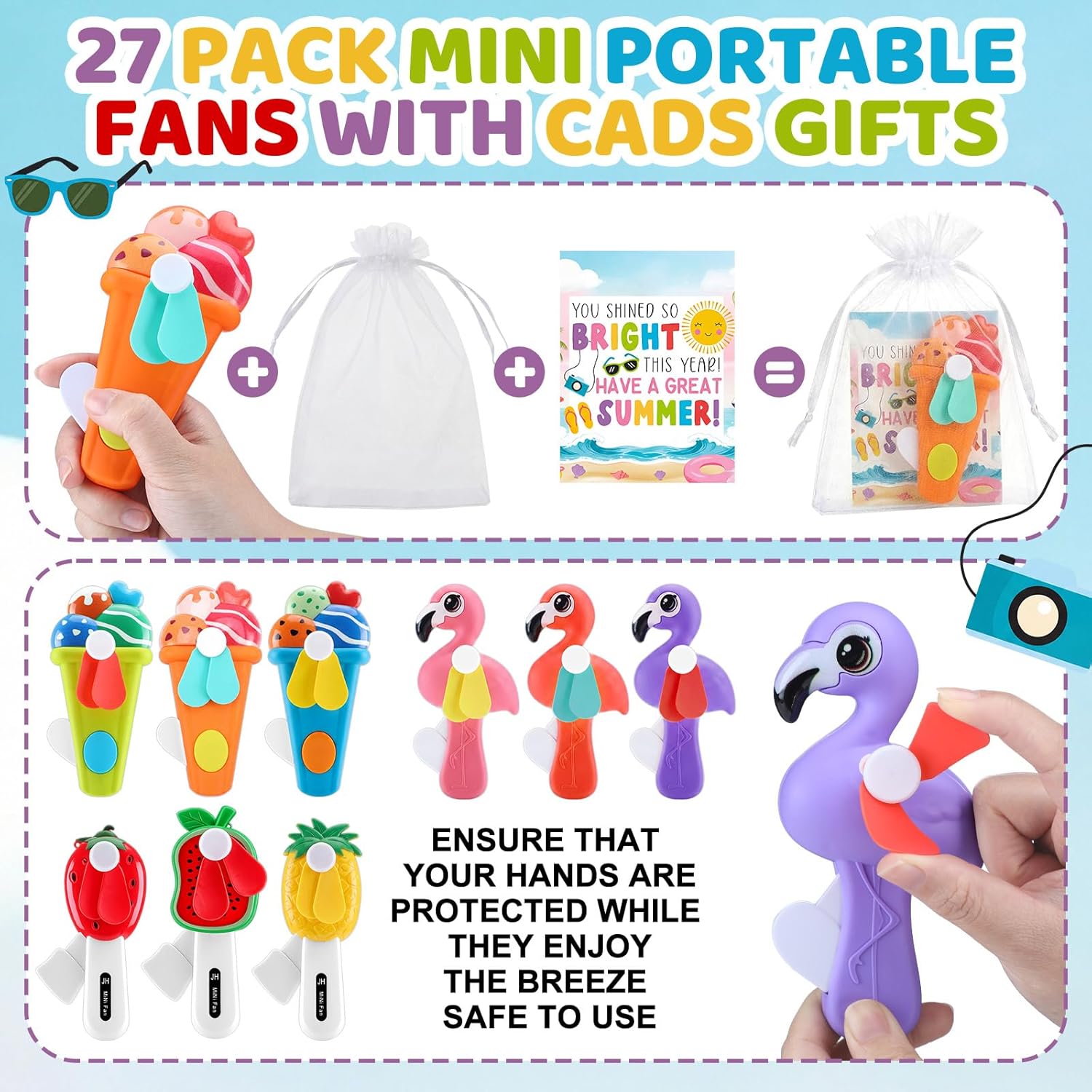 Features: Ideal for Group Gifting & Event Giveaways: The generous quantity of 27 fans with matching gift accessories makes this set a top choice for event organizers, teachers and parents for group giveaways. It eliminates the trouble of separate gift preparation and ensures a unified, lovely gifting experience for all recipients at year-end or summer events. No Power Needed for Anytime Coolness: The battery-free manual design means the mini fans work anywhere, anytime—no need to charge or replace batteries, perfect for outdoor summer trips, classroom use and on-the-go cooling where power sources are unavailable. A convenient and fuss-free cooling solution for all summer and year-end activities. Specifications: Material: plastic Color: multicolor Size: Mini fan: 5.9 x 2.8 inches/ 15 x 7 cm Gift card: 3.9 x 3 inches/ 10 x 7.5 cm Organza gift bag: 5.1 x 7.1 inches/ 13 x 18 cm Package includes: 27 x Mini fan 30 x Gift card 30 x Organza gift bag Notes: Manual measurement, please allow slight errors on size. The color may exist a slight difference due to different screen displays
