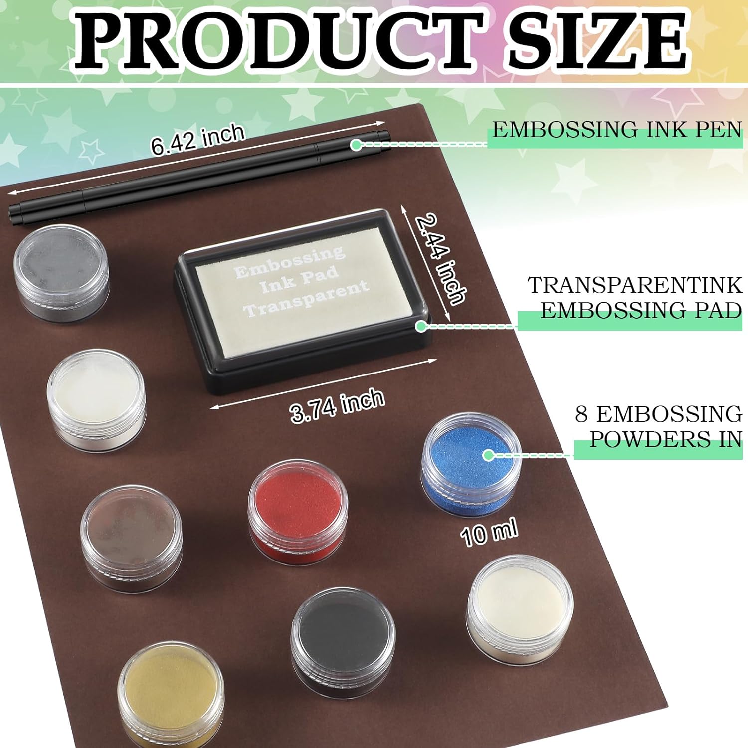 Features: Embossing Ink Pad: Embossing ink pad capture the crisp details of watermark embossing create tonal effects and more. Paper artisans of all skill levels love this inkpad for embossing as well as for pearlescent powder and chalk Nice Gift: At a low price our embossing kit is versatile and suitable for all ages they make thoughtful gifts for birthday parties halloween and other meaningful occasions. Suitable for use memorable and fun Specifications: Material: Embossing powder: resin Color: blue silver black gold green pearl red and bronze Size: As shown in the figure Package includes: 8×5g bottles of embossing powder Notes: Manual measurement, please allow slight errors on size. The color may exist a slight difference due to different screen displays
