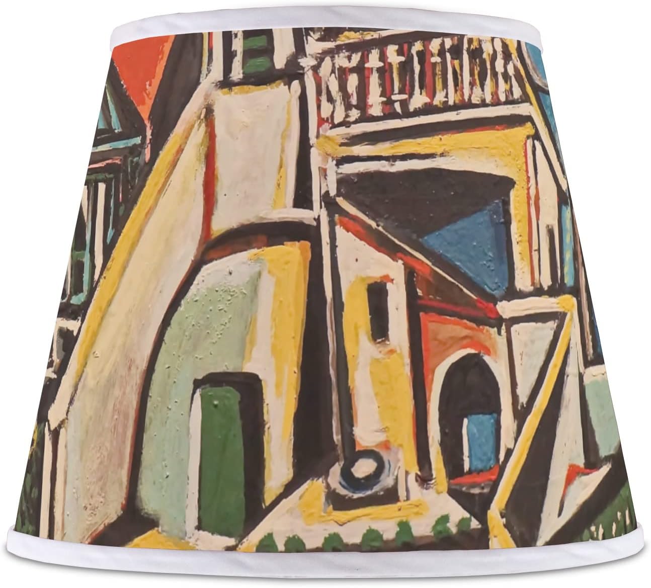 Transform any room in your home by livening up its lighting fixtures with one of our empire lampshades! These small lampshades work as a delightfully charming, decorative piece in any room; they can function as table lampshades on an entry table or a reading nook, or they can work as bedside lampshades in a kid's room!The base of this lampshade is 12 inches in diameter, and the top spans 8 inches in diameter. The total height of the lampshade is 10 inches. The angled nature of this custom lampshade concentrates the light, making it ideal for smaller spaces. This lampshade is made of matte, polyfilm, and displays your customization in its middle. The top and bottom of this colorful lamp shade are lined with a white fabric ribbon (which can be replaced with black inside the design studio) which frames your design and creates a sophisticated finish. As an UNO fitter lampshade, this unique lamp shade will fit a variety of bases.Design Shown: Mediterranean Landscape by Pablo Picasso (#1321067)Features:==================================== * [Innovative Design]: Features an angled shape that concentrates light, ideal for small spaces. * [Quality Material]: Crafted from matte polyfilm for a sleek and sophisticated finish. * [Stylish Accents]: Top and bottom are lined with a white (or black) fabric ribbon for a refined touch. * [Versatile Fit]: With an UNO fitter, this lampshade is suitable for a variety of bases.Care Instructions:==================================== * Dust occasionally * Wipe with soft cloth