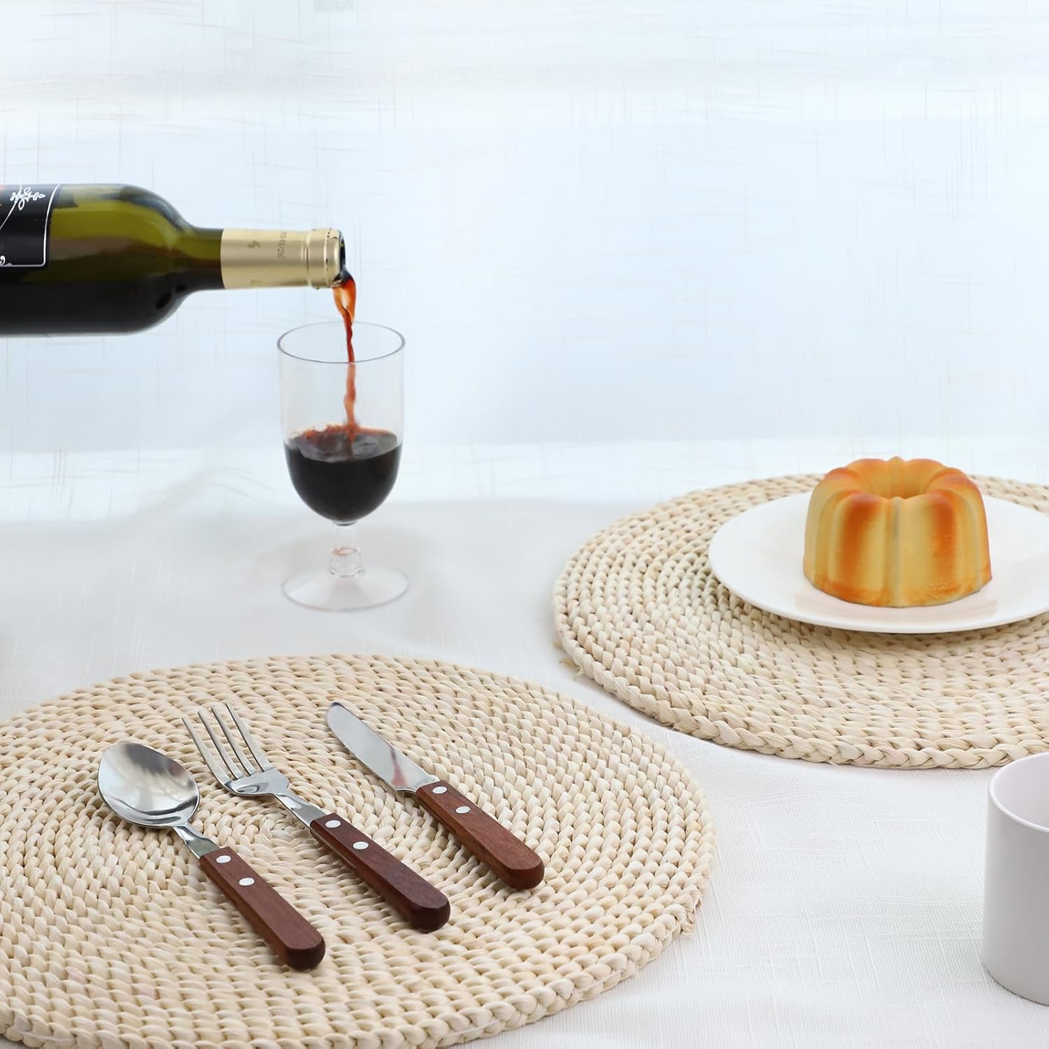 Enhance the dining experience and bring a touch of natural elegance to the table with this set of 6 round woven placemats. Crafted from eco-friendly water hyacinth, these placemats showcase a stunning braided straw design that adds rustic charm to any dining setting. Measuring 13.8 inches in diameter, these generously sized placemats provide ample space for your plates, cutlery, and drinkware, ensuring a well-organized and stylish table arrangement. The intricate weaving technique not only adds visual appeal but also showcases the craftsmanship behind each piece, making them a true work of art. Designed for both style and functionality, these placemats offer protection for your table surface against scratches, spills, and heat damage. Whether you're hosting a casual family dinner or entertaining guests for a special occasion, these mats provide a reliable shield while elevating the overall aesthetic of your table. Crafted from cattail straw, a sustainable and eco-friendly material, these placemats offer an eco-conscious choice for your home. The natural fibers used in their construction lend a warm and inviting touch to your dining space, effortlessly blending with various decor styles.