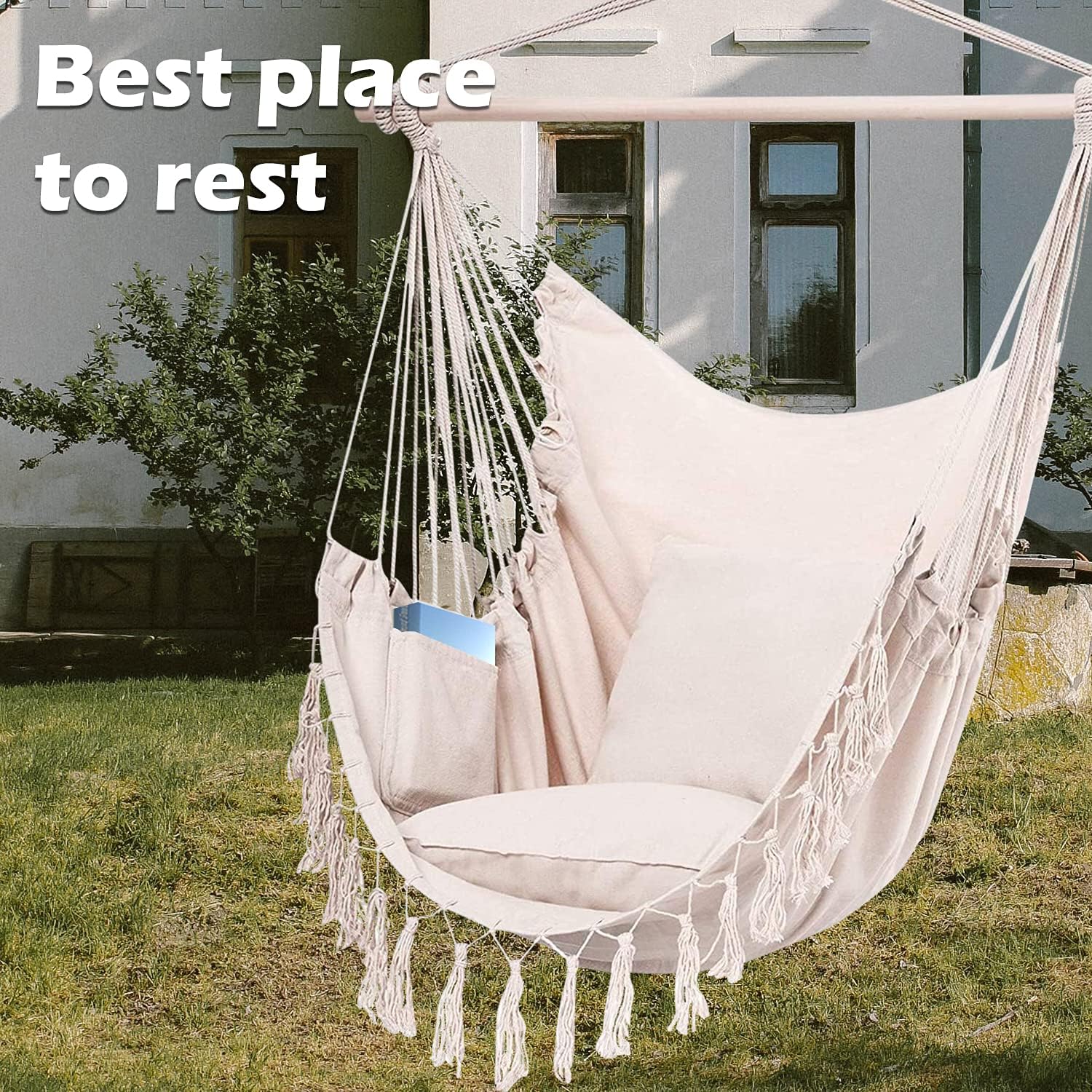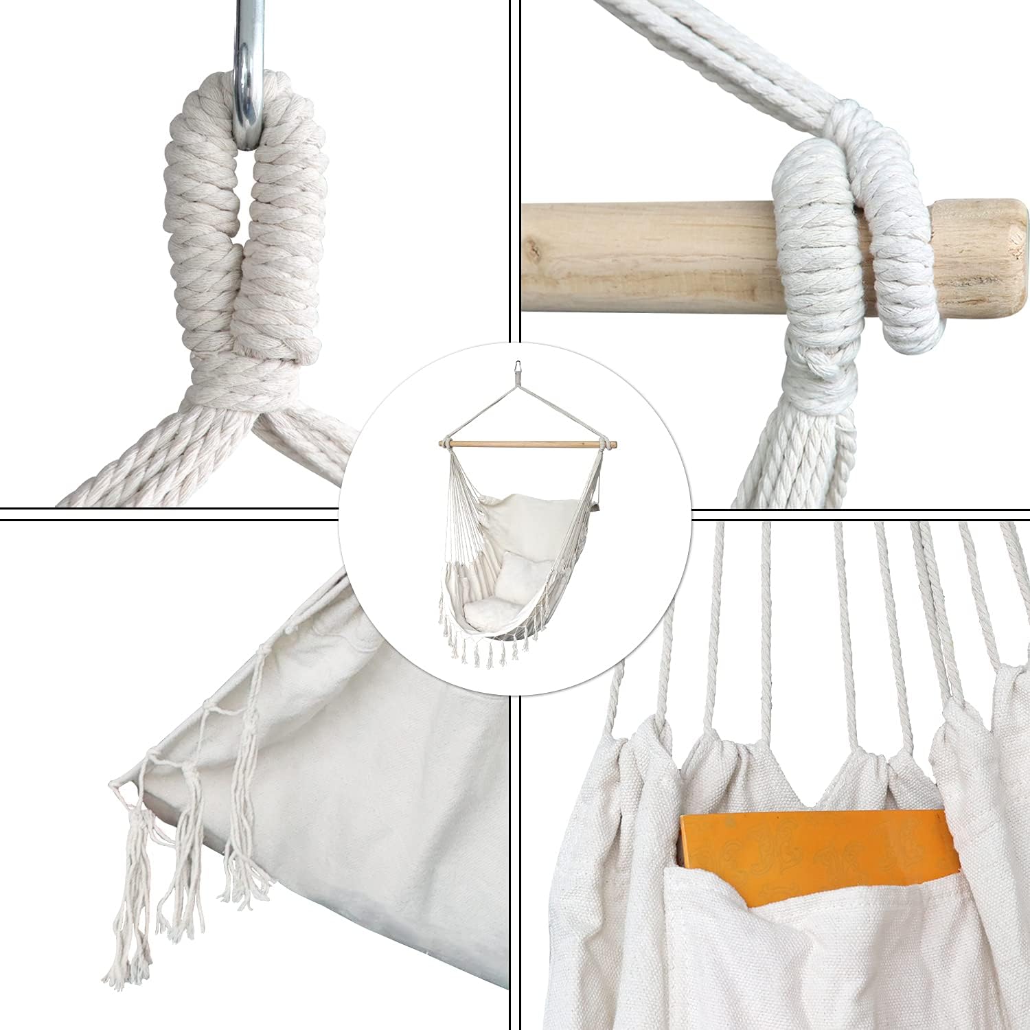 MATERIAL Stainless Steel Hardware kit,Cotton + Polyester,Wood bar SIZE Hammock size:59 x 47 inches Bar length:40 inches Chain length:60 inches BEARING CAPACITY 330 Lbs PACKAGE INCLUDES 1 x hammock chair 1 x hardware kit for ceiling mount 2 x cushions FEATURES Pocket design:You can put your phone or book in it when you take a rest. Quality material and designed construction:Enjoy floating in the air, relax yourself without concerning about it would not be strong and sturdy enough. Easy assembling:Comes with all the accessories you need for assembling. Natural material and craft:Coarse but stylish look Handmade macrame:Would be a great decor for your house ... ADD IT TO YOUR CART AND ENJOY YOUR COMFY HAMMOCK SWING!